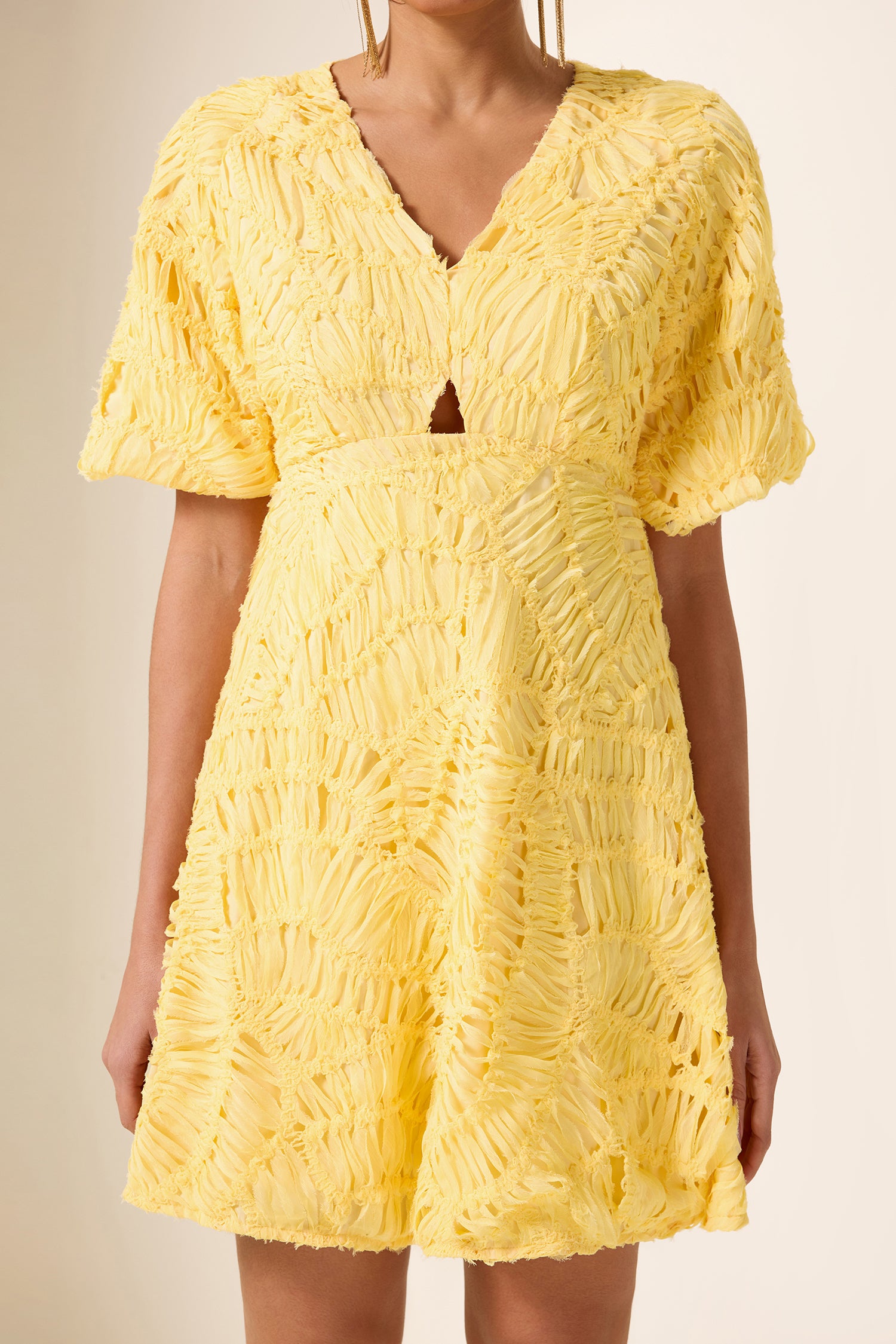 - Solid color, mid sleeve, yellow, mini dress, lace, cut out, puff sleeve, v-neck