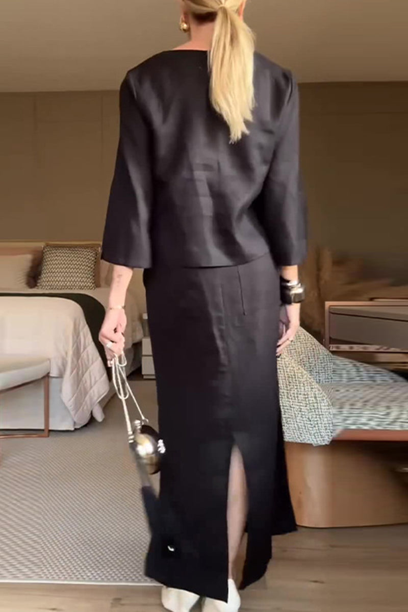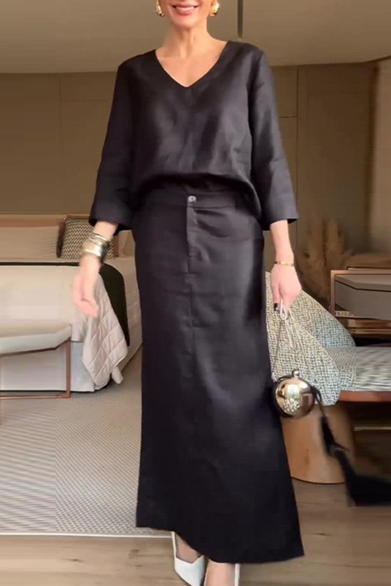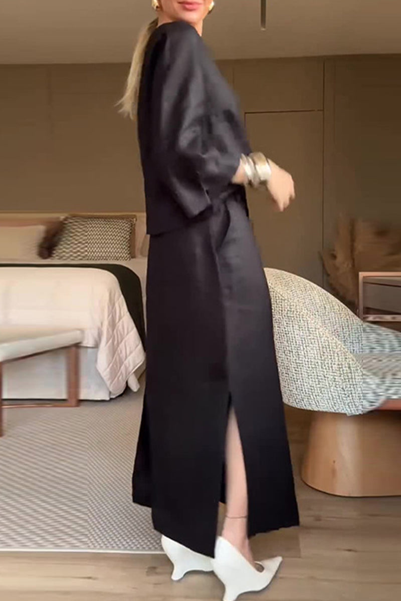 Daily Elegant Solid Color Buttons Slit V Neck Three Quarter Two Pieces