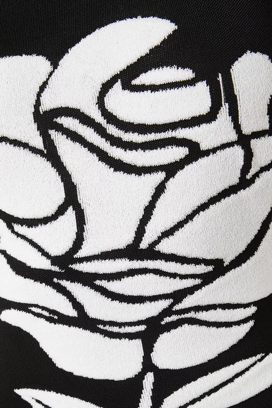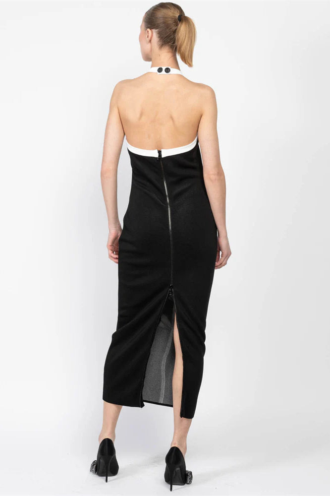 - Halterneck, Sleeveless, Rose Motif, Open Back Design, Contrasting Trim, Midi Length.