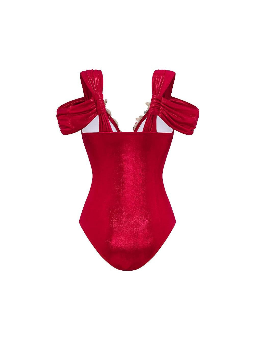 Deep V Neck Luminous Fabric Swimsuit & Skirt Coord Set