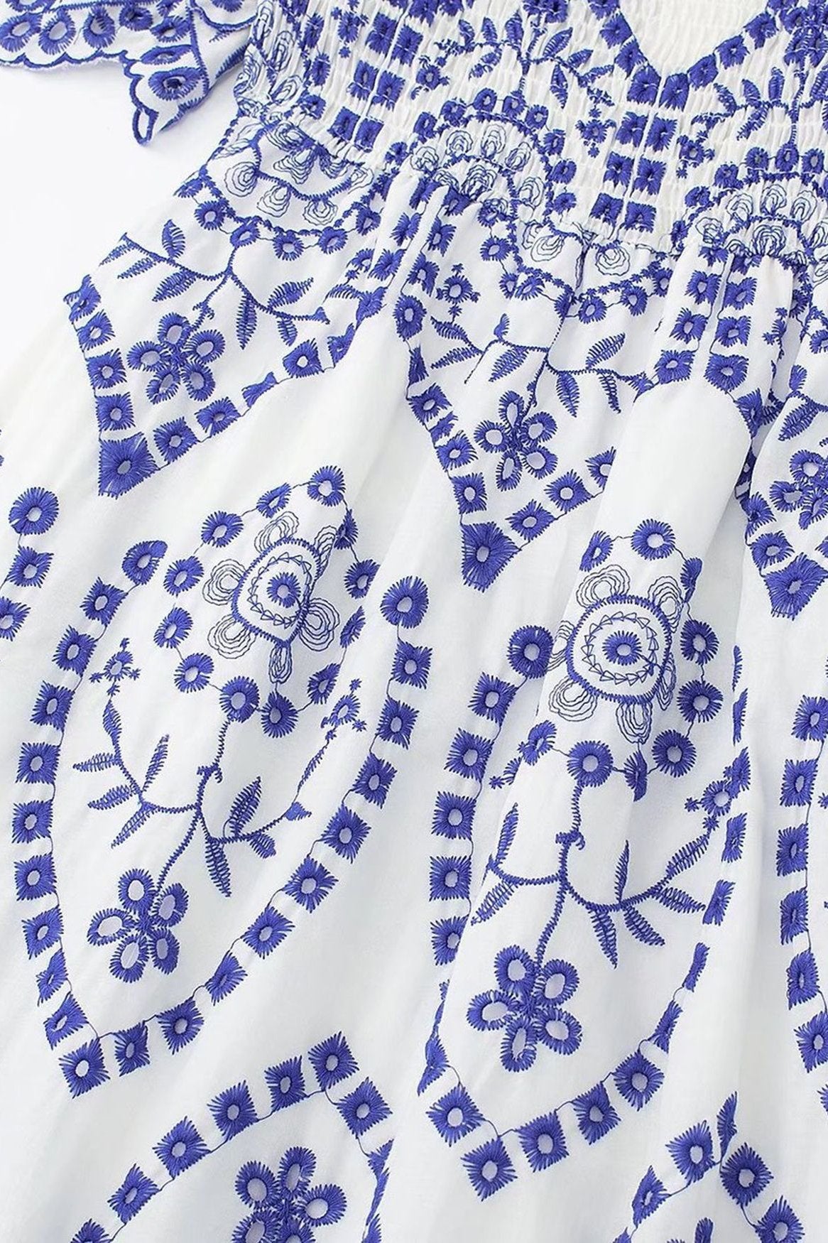 Della Embroidery Lace Ruffle Shirred Midi Dress