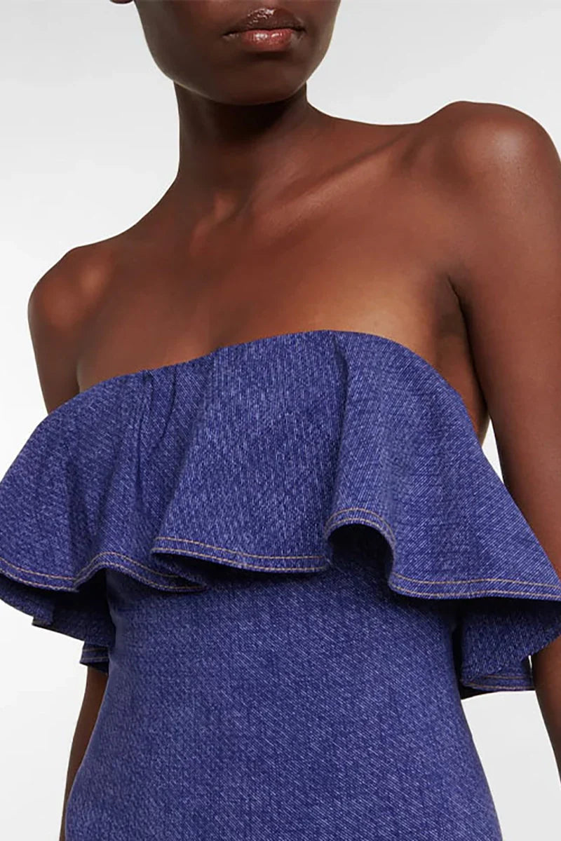 Bandeau cuts highlight shoulders with a clean, strapless finish bow detail adds femininity and charm ruffle trim and denim-inspired texture offer playful contrast high-stretch fabric provides a flattering, supportive fit.