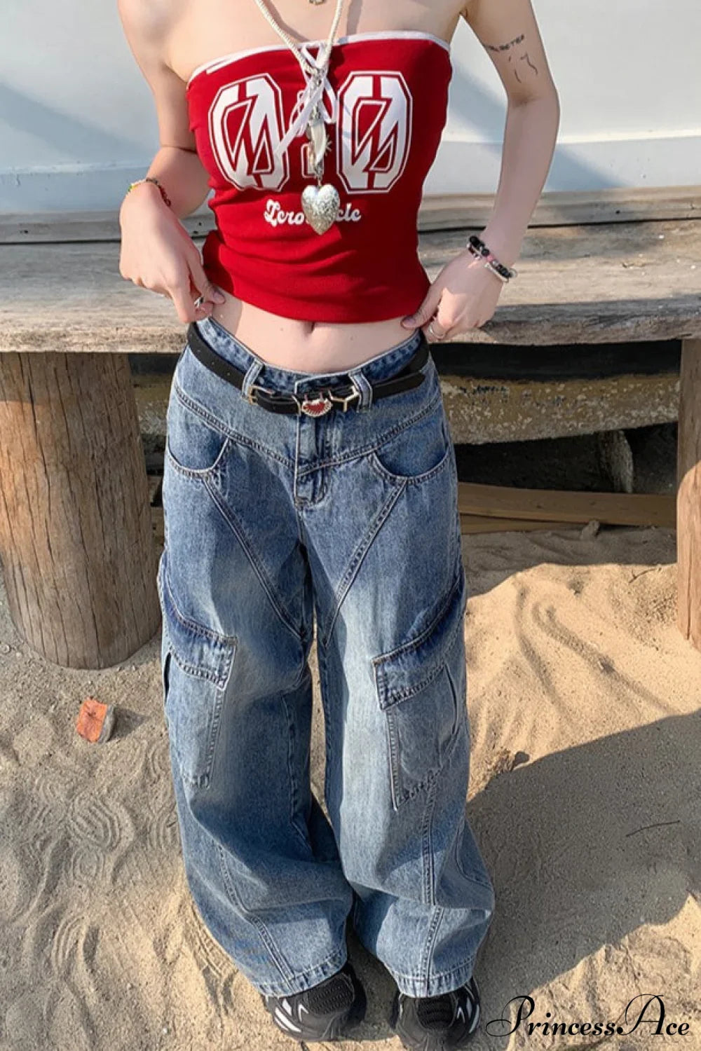 Denim Diagonal Split Wide Leg Cargo Pants