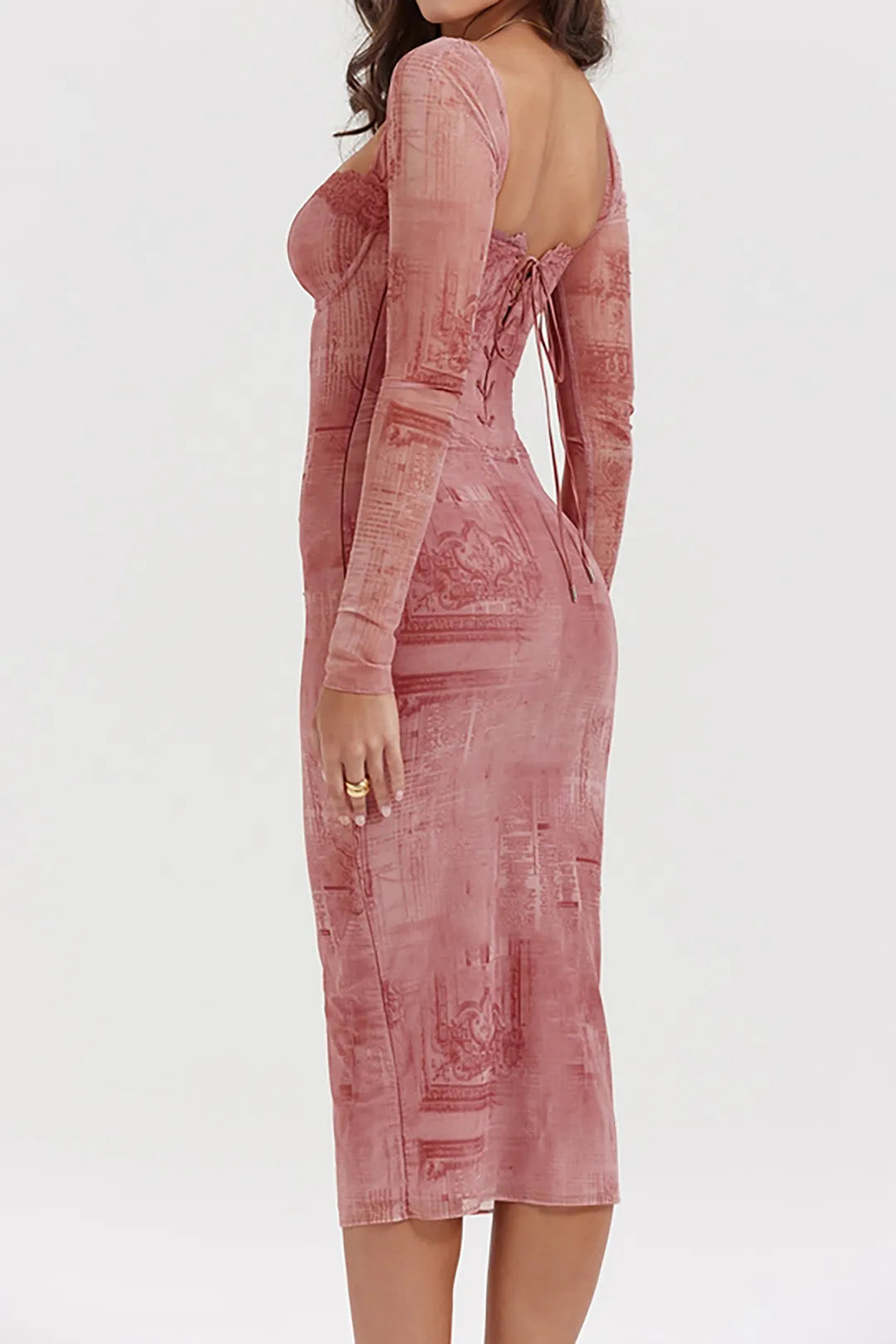 Dlore Pink Newspaper Pattern Lace Tie Backless Midi Party Dress