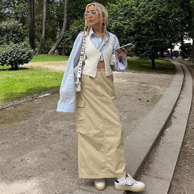 Drawstring slit pocket cargo solid high rise midi skirt-final-sale