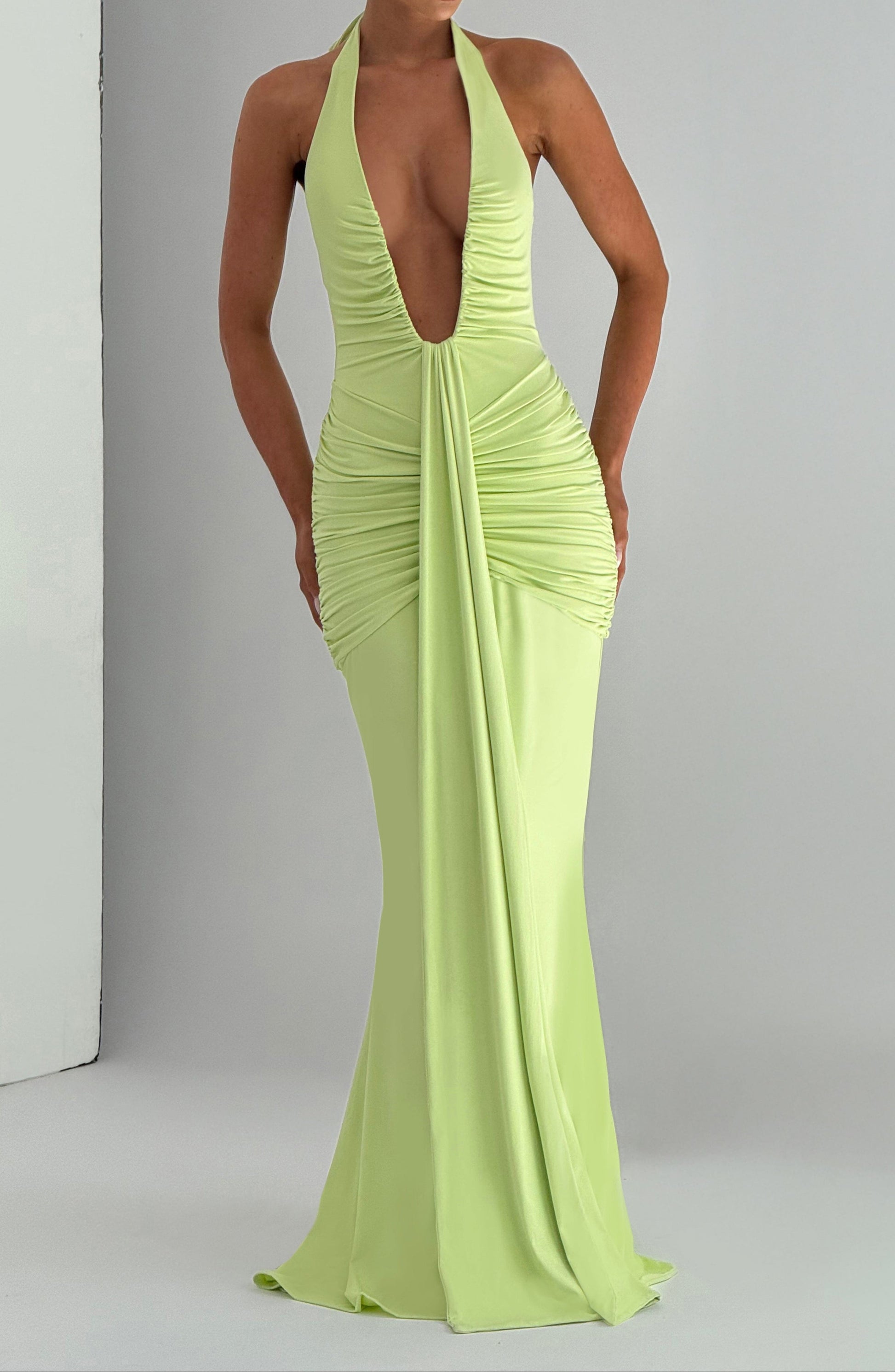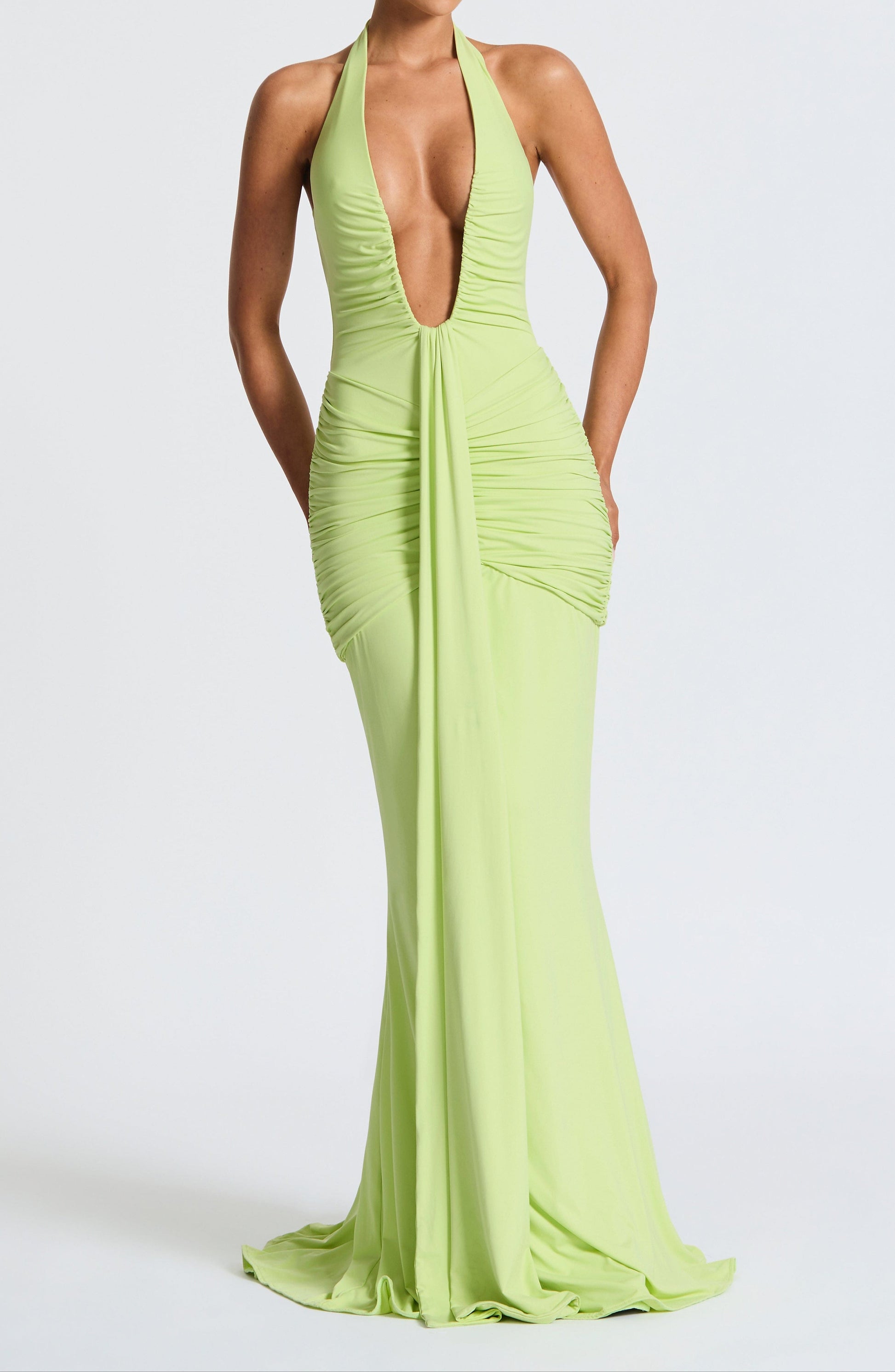 Make a statement with this stunning maxi dress, designed to blend luxury with effortless elegance. The vibrant lime hue and slinky jersey fabric create a eye-catching look, while thoughtful details like the plunge neckline and draped panel add a touch of sophistication.