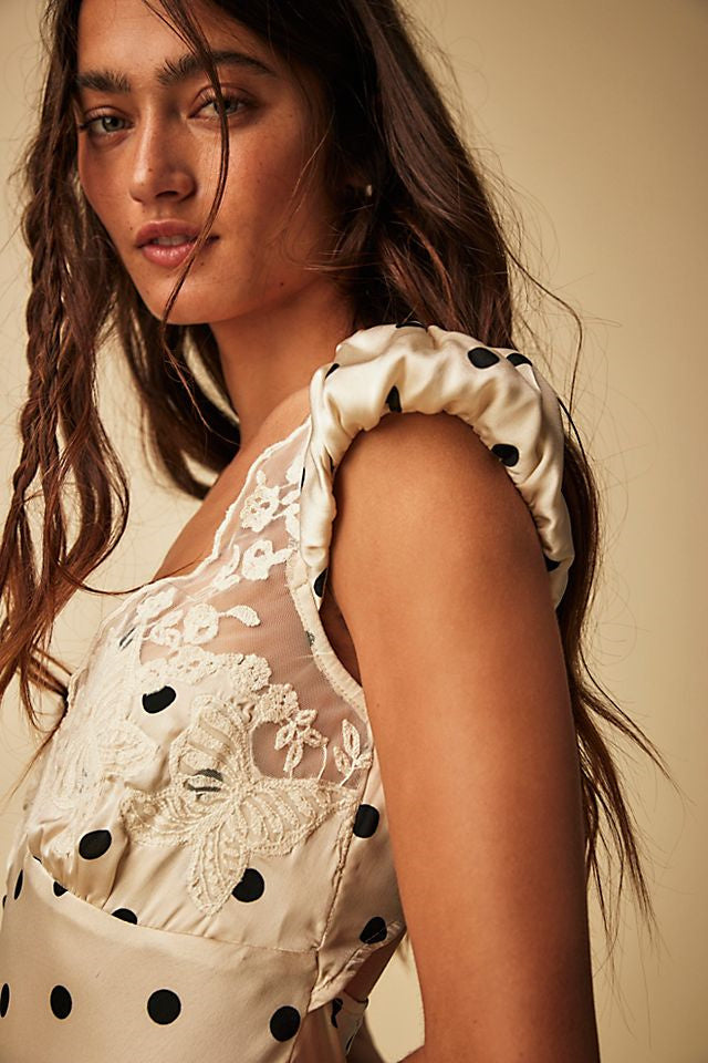 Polka Dot, A-line Silhouette, Butterfly Lace-adorned Neckline, Puffed Capped Sleeves, Maxi Length.