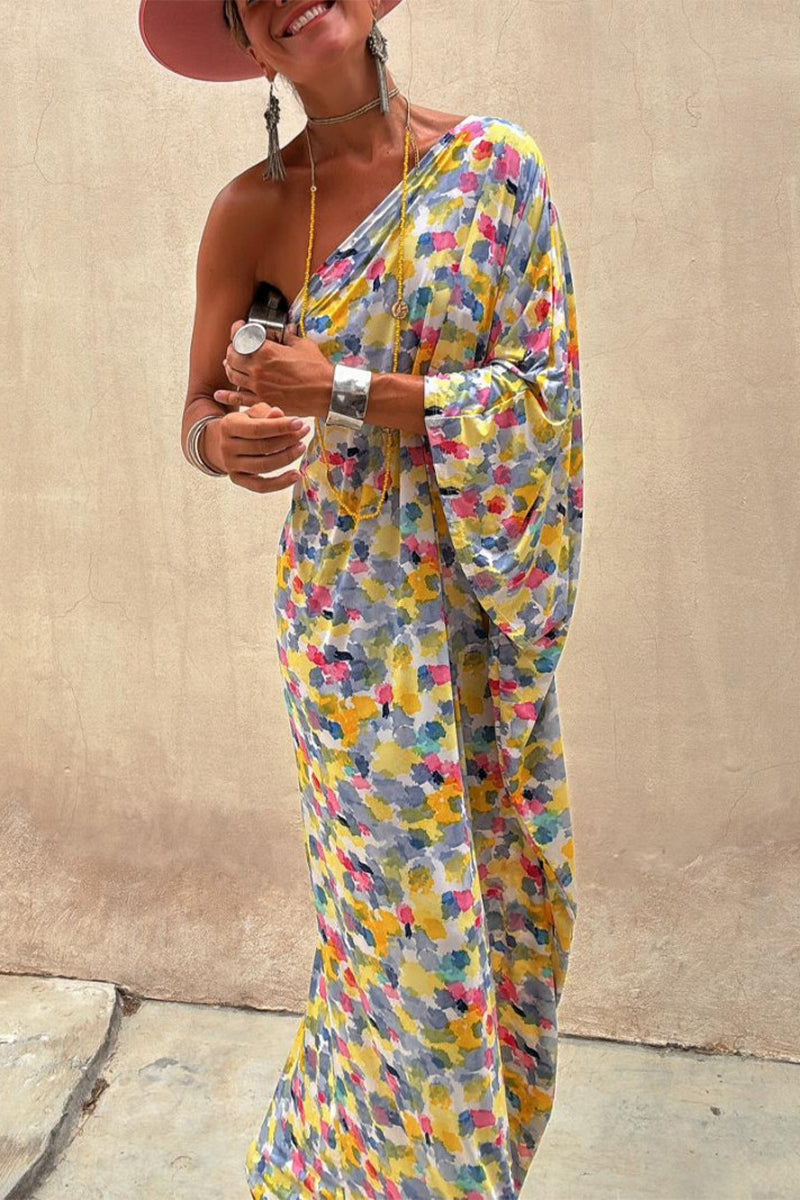 Elegant Geometric Print Irregular Oblique Collar Irregular Dresses