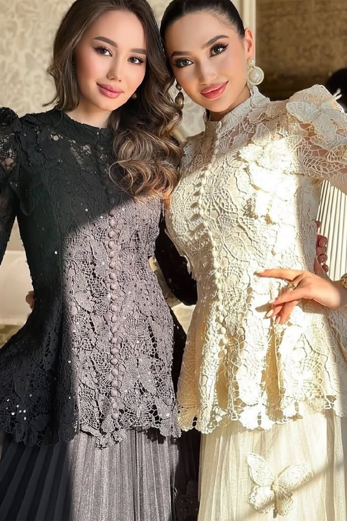Mock Neck, Butterfly Detail, Single-breasted Buttons Decorated, Lace Panelling, Semi-sheer, Maxi Length.