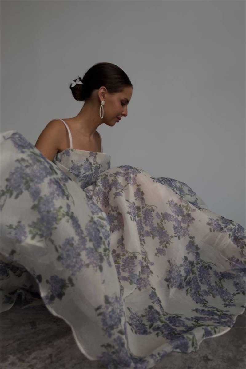 - Floral Prints, A-line Silhouette, Flared Skirt, Thin Strap Design, Midi Length.