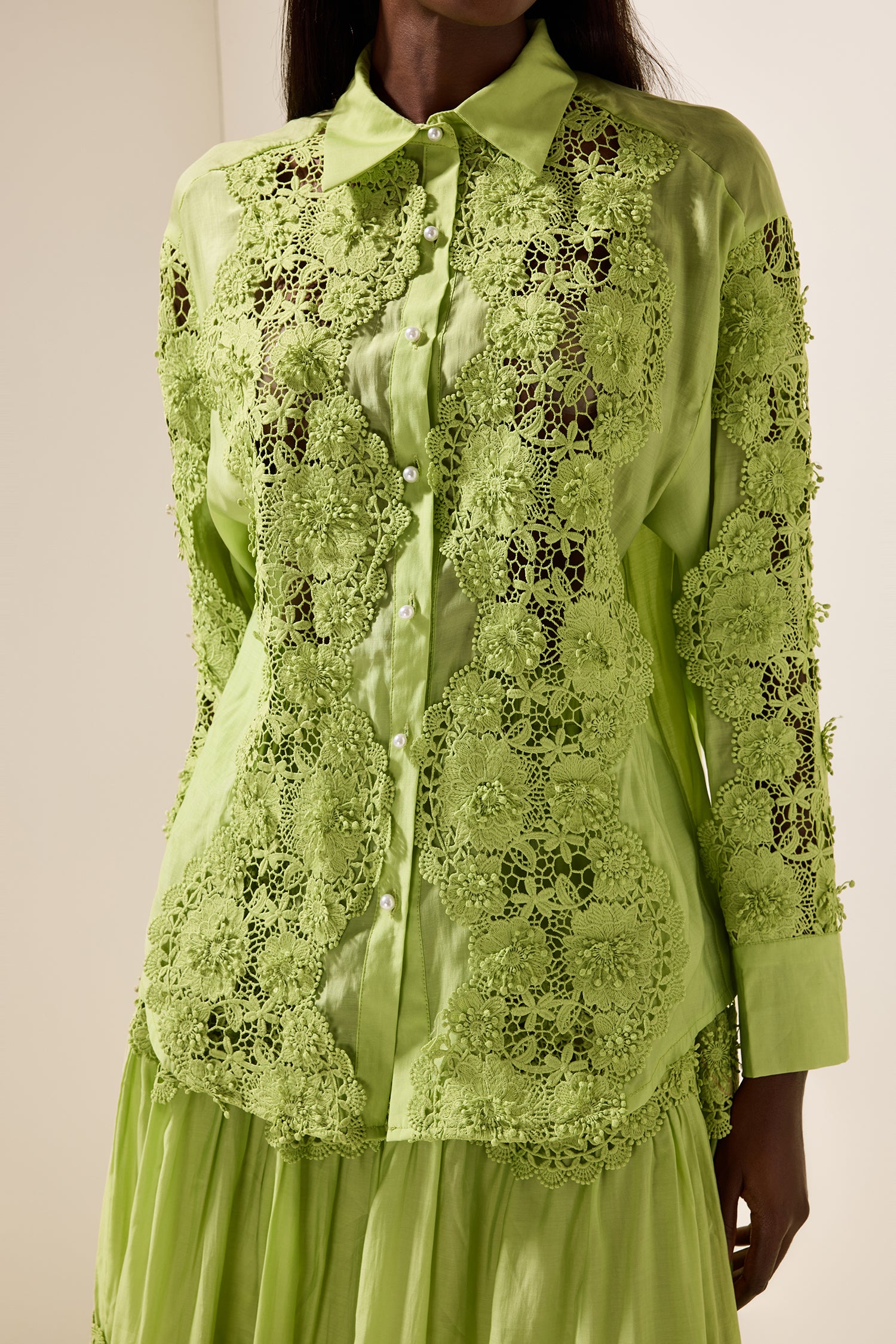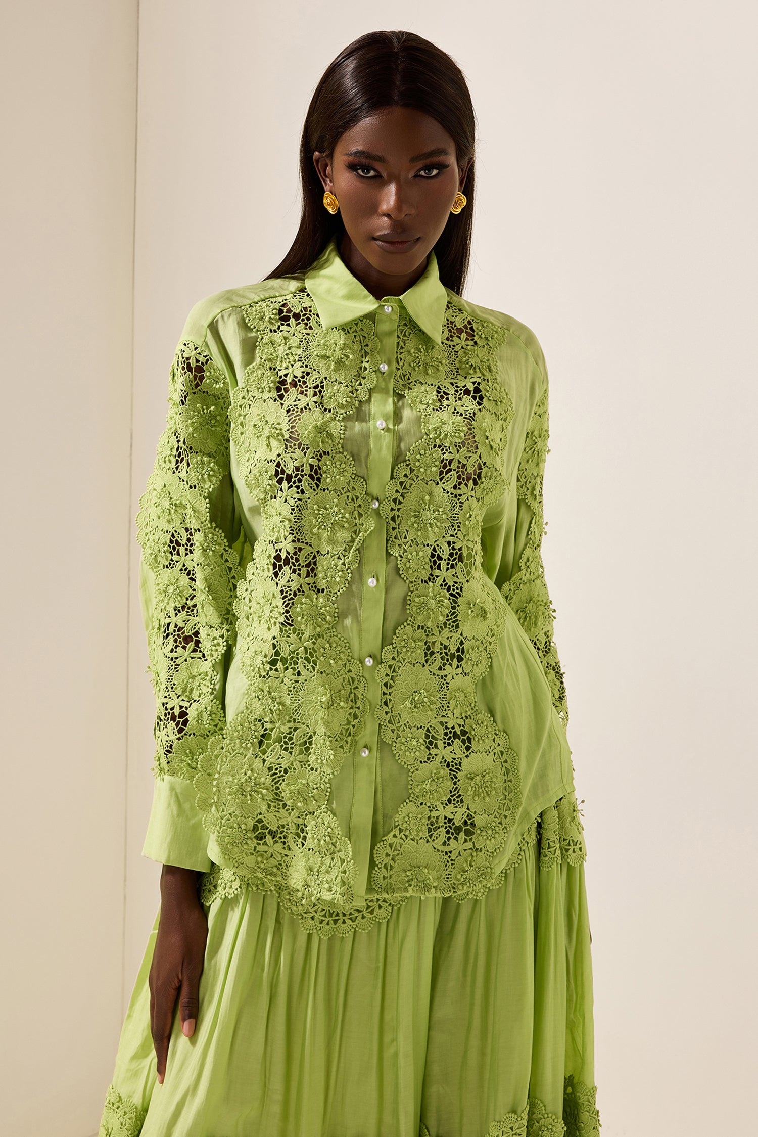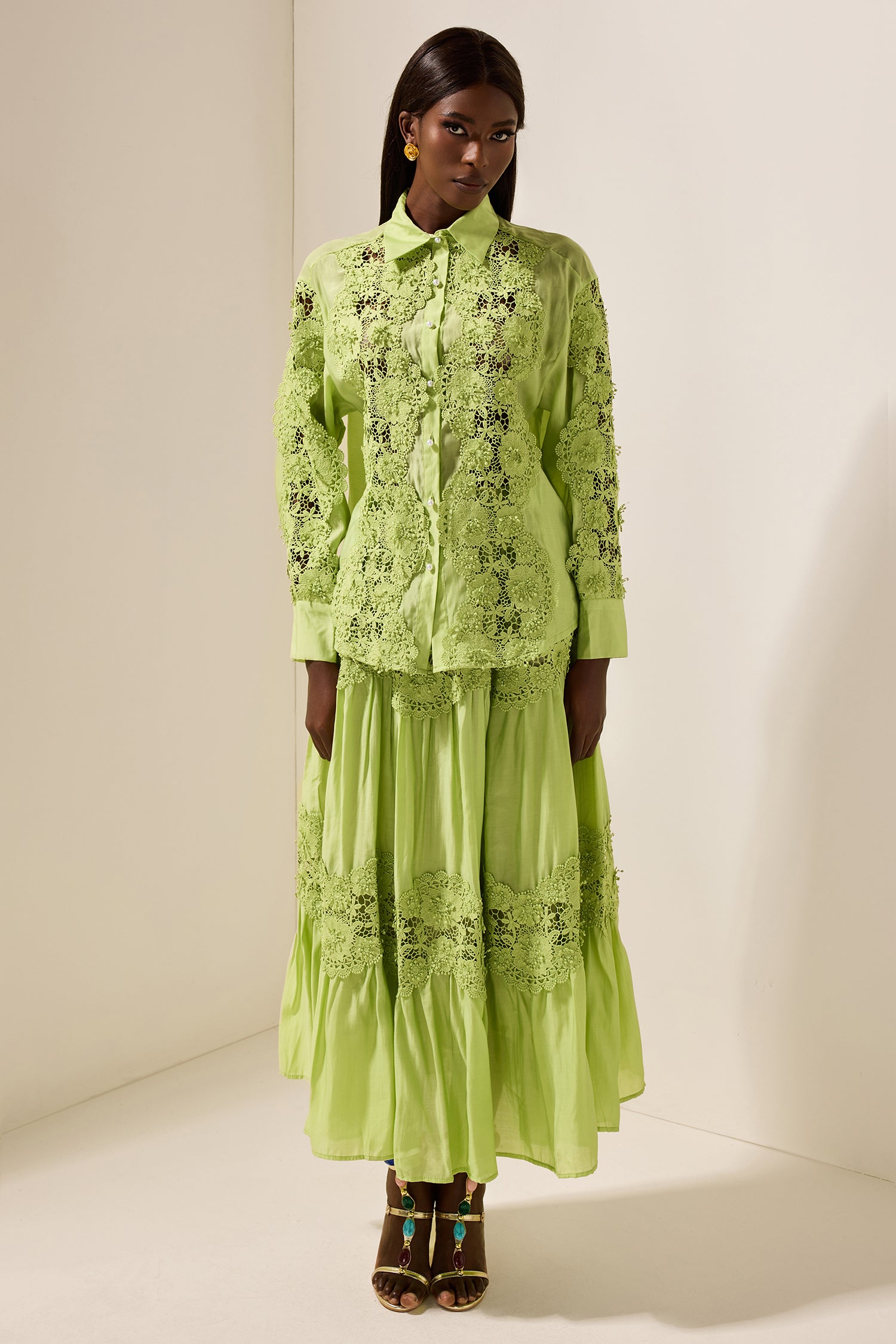 - Long sleeve, solid color, green, lace, top, embroidered, mid waist, midi skirt