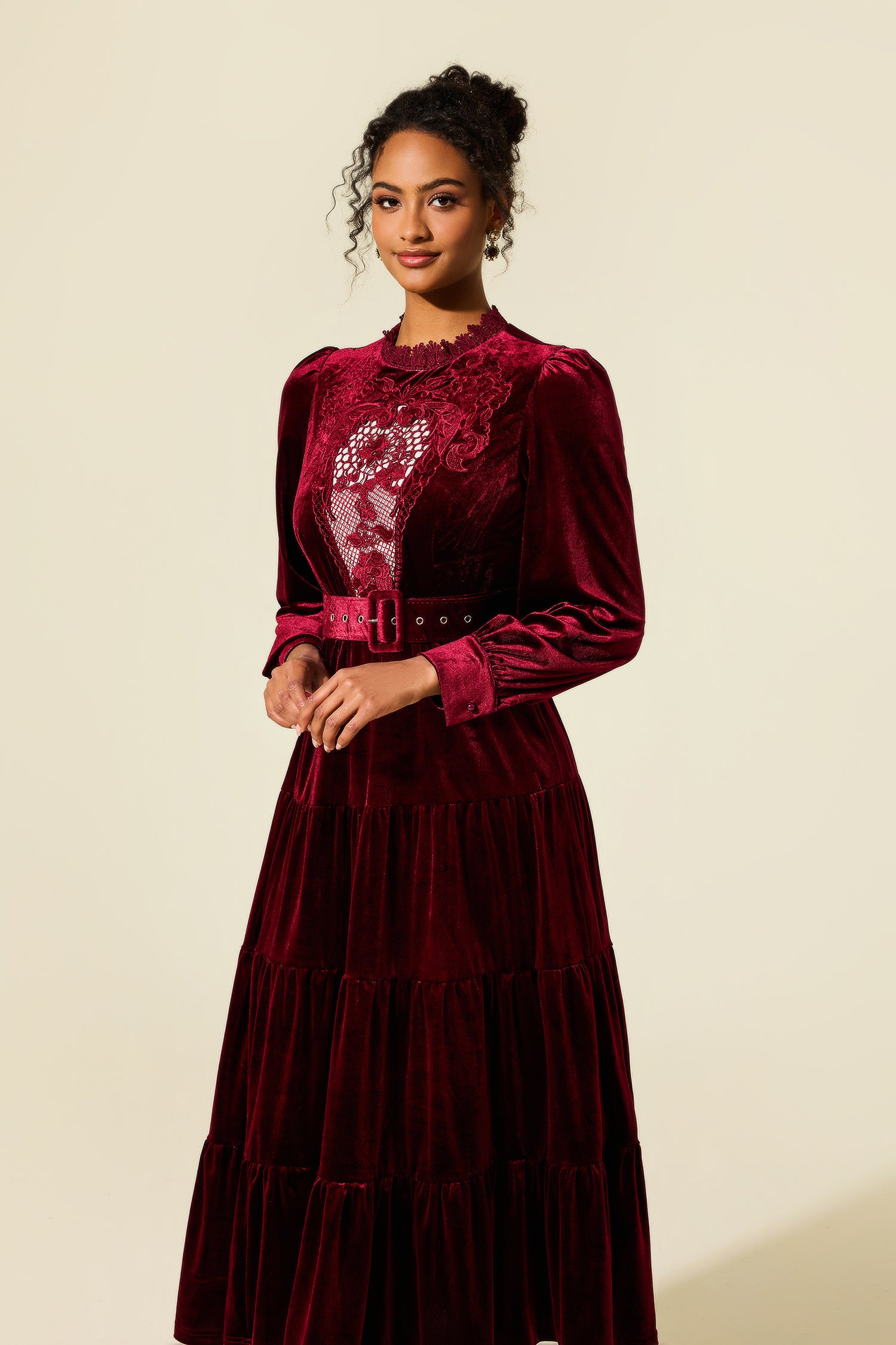 - Lantern sleeve, belted, long sleeve, solid red, ruffle