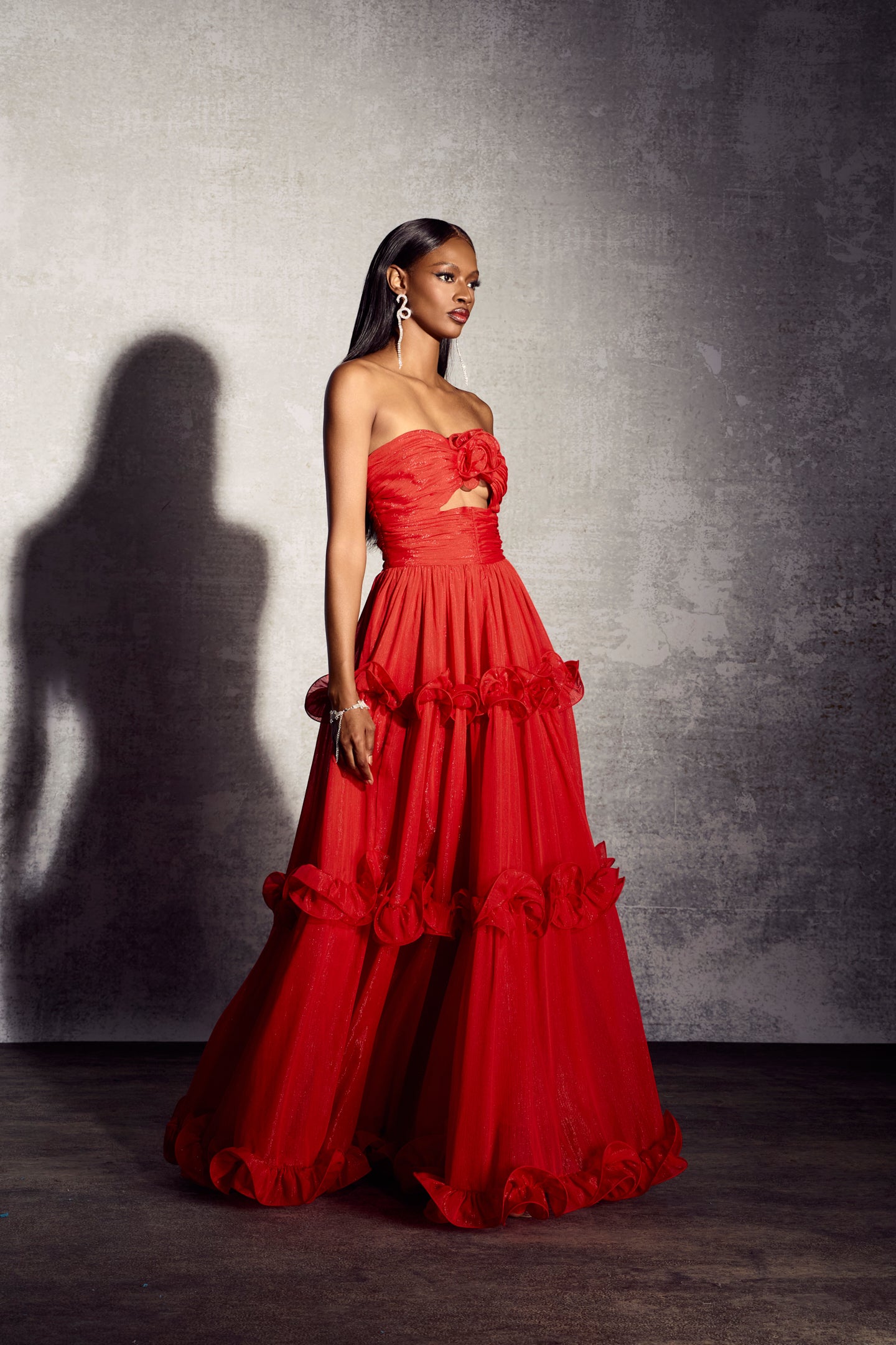 Pleated Strapless Bodice, 3D Flower, Cut-out Design, Layered Ruffles, Full Circular Dress, Ankle Length.
