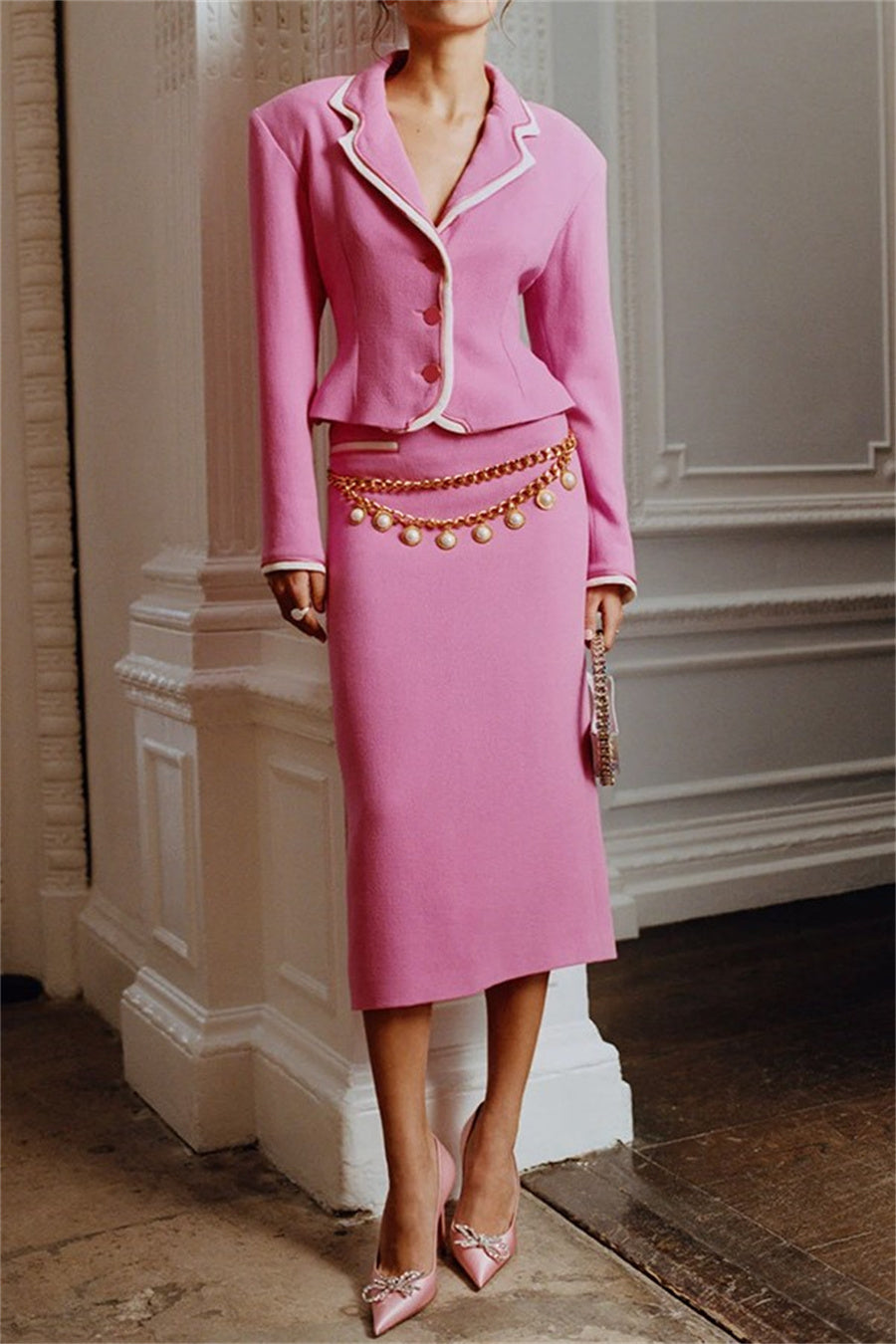 Introducing the Erika Contrast-Trim Jacket Two Piece Set. Elevate your style with this sleek and sophisticated set, featuring a chic contrast-trim jacket and a waist chain. Perfect for adding an elegant touch to any outfit, this set is a must-have for those who appreciate luxury fashion.