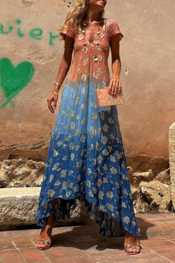 Evaluna Tie Dye Gradient Golden Flower Print Short Sleeve A-line Maxi Dress