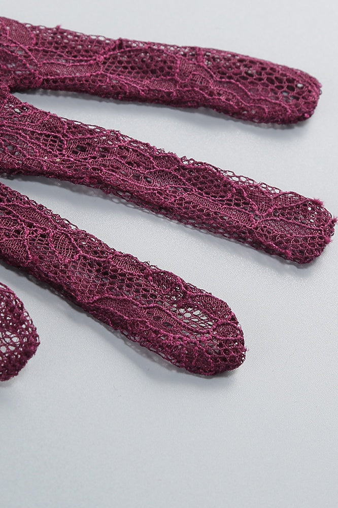 Plunging Cowl Neckline, Sleeveless, Lace Bodice, Detachable Lace Gloves, Maxi Length.