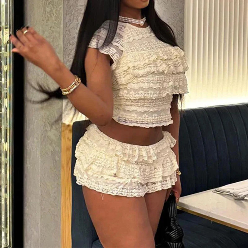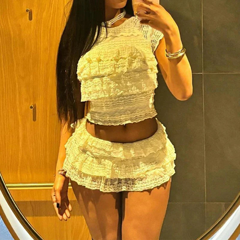 Fairy Coquette Outfits Lace Layered Ruffles Tank Tops + Mini Cake Shorts 2000s Retro Kawaii 2 Piece Set Y2K Aesthetic Crop Tops