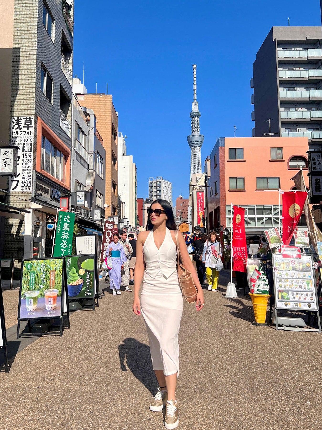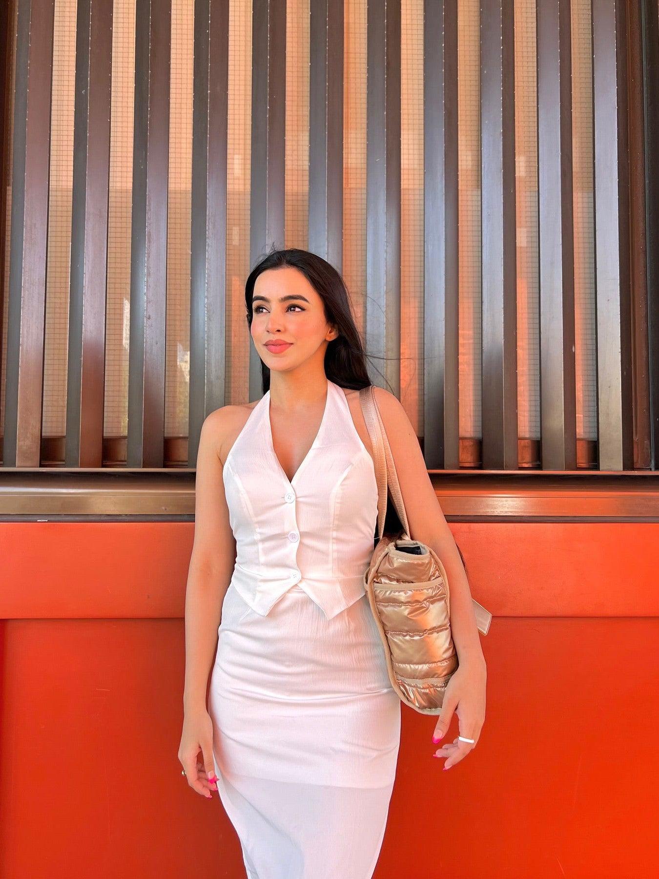 V Neck Halterneck Top & Low Waist Slit Skirt Coord Set