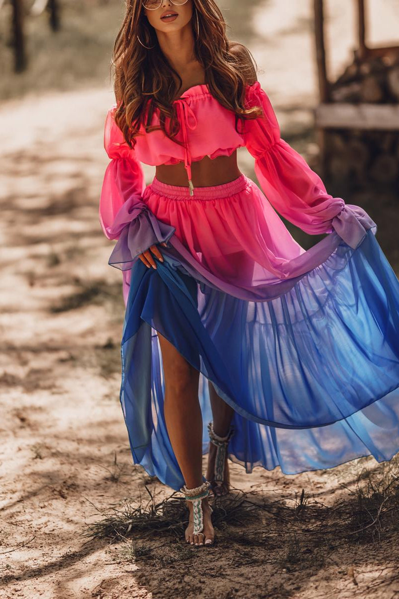 Fashion Casual Print Split Joint Off the Shoulder Long Sleeve Two Pieces