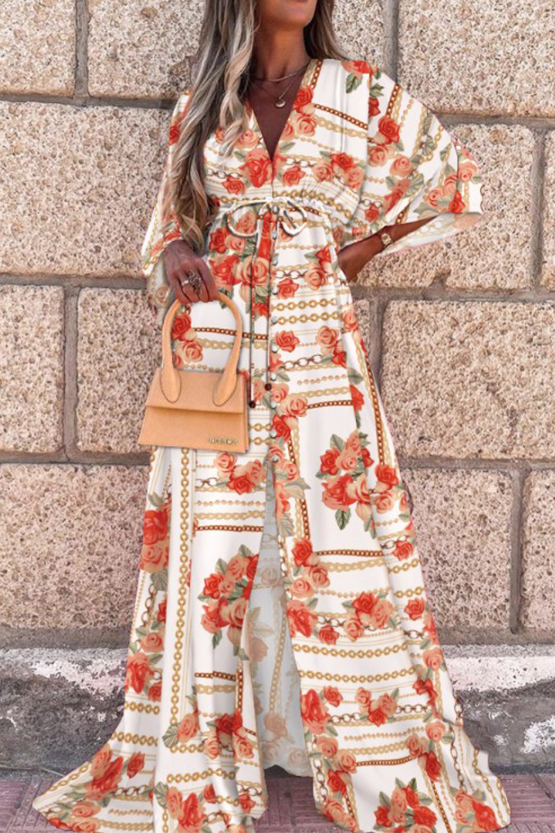 Fashion Elegant Frenulum Slit V Neck Printed Dress Dresses(4 Colors)