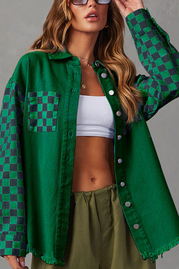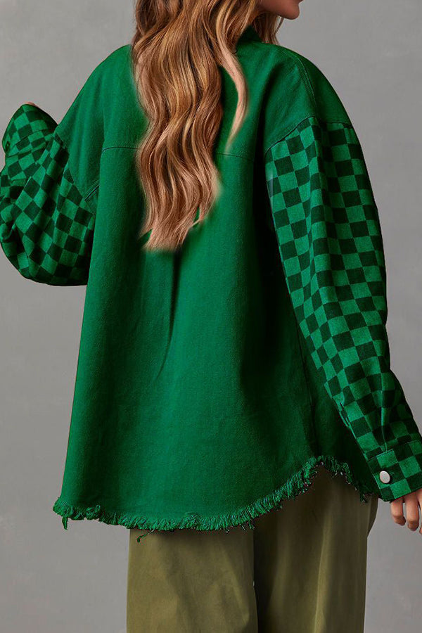 Fashionable casual loose plaid contrasting raw edge denim jacket