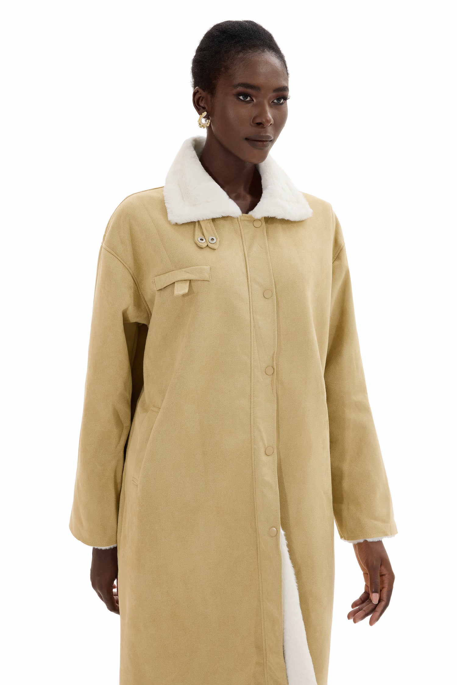 - Beige, faux shearling, long sleeve, contrasting collar, coat