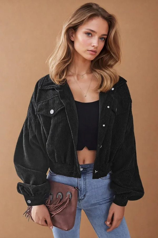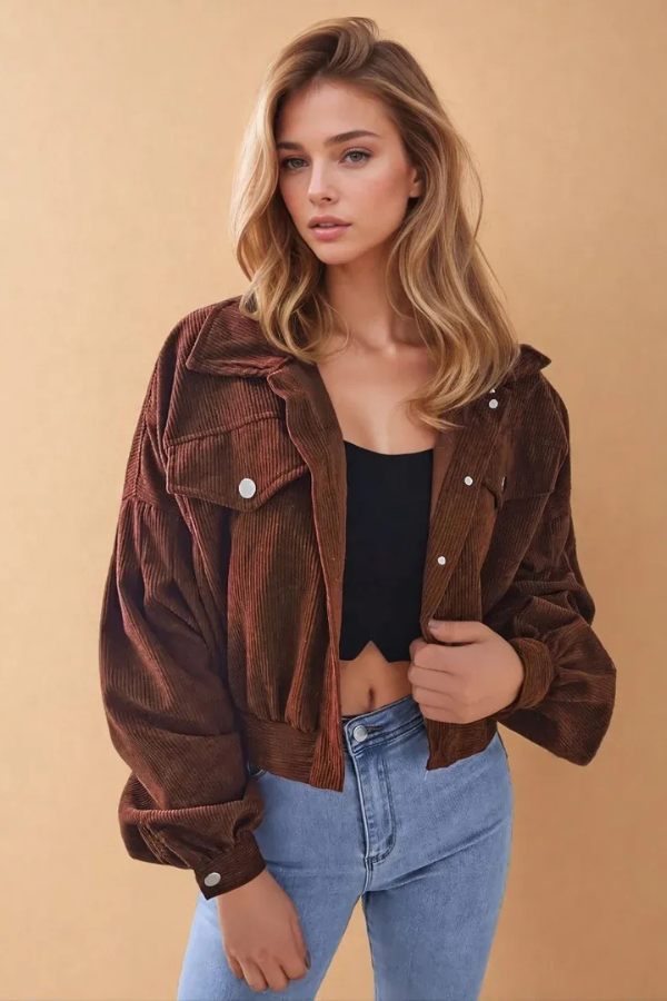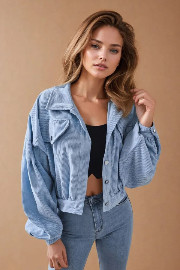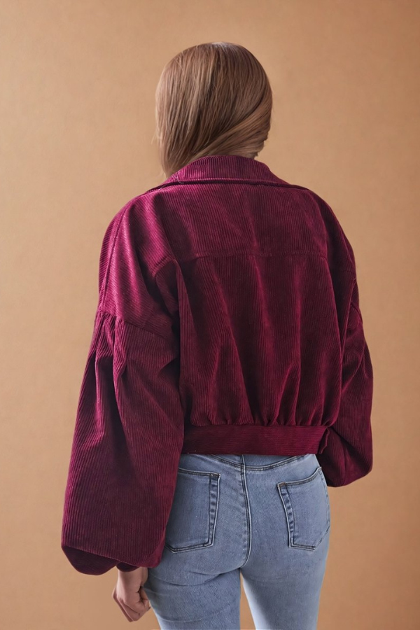- Bright, bold, and versatile, this corduroy jacket combines a vintage vibe with modern style. The lantern sleeves and cropped design add flair, making it an ideal choice for both casual days and nights out.