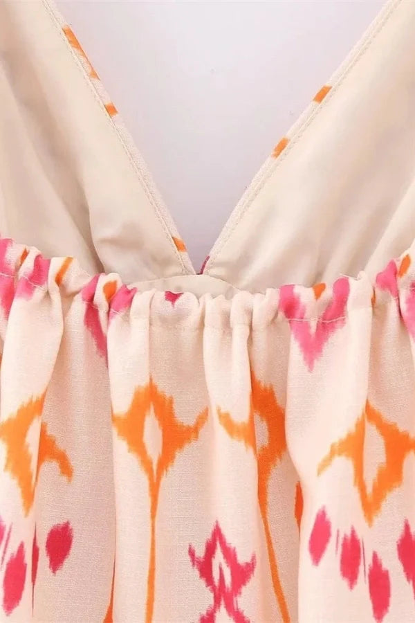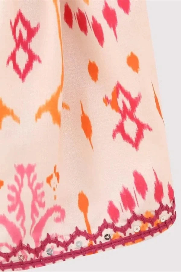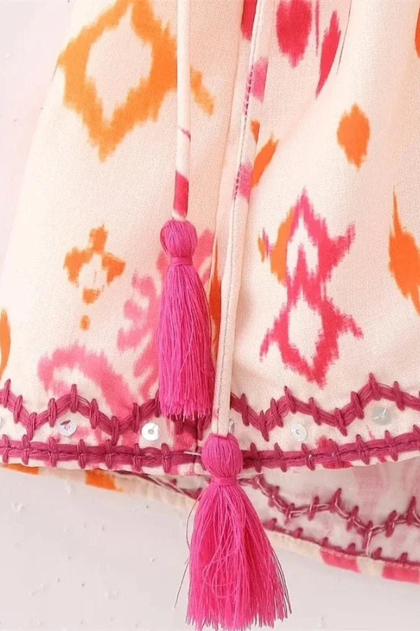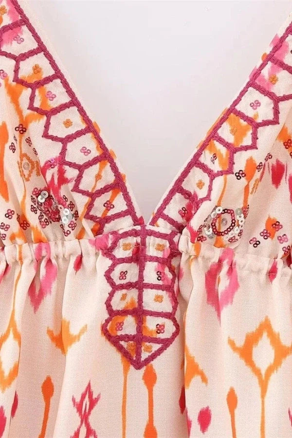 Vacation-ready elegance meets boho charm. Featuring a lightweight woven design, ruffle details, and a bold Aztec pattern, this oversized, lined maxi dress with a flattering V-neckline is your ultimate go-to for effortless style.