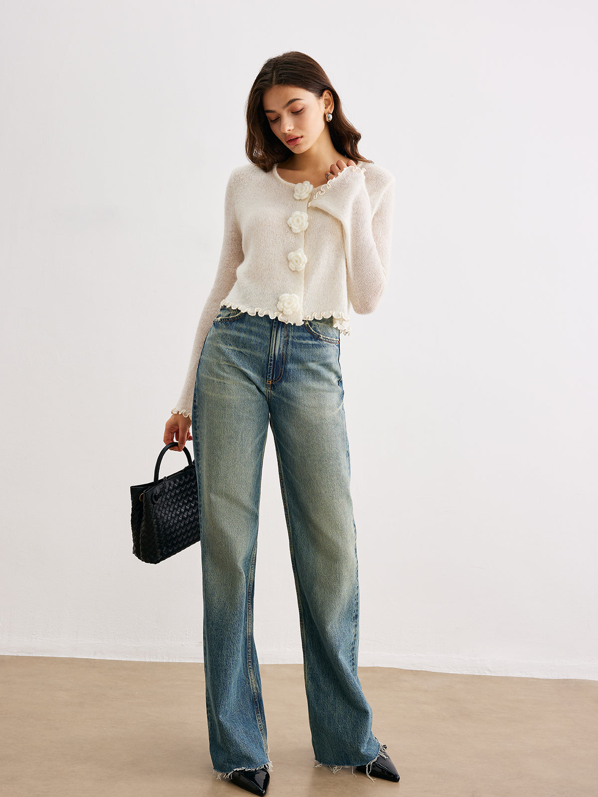 Wool-Blend Lettuce Trim 3D Flower Cardigan