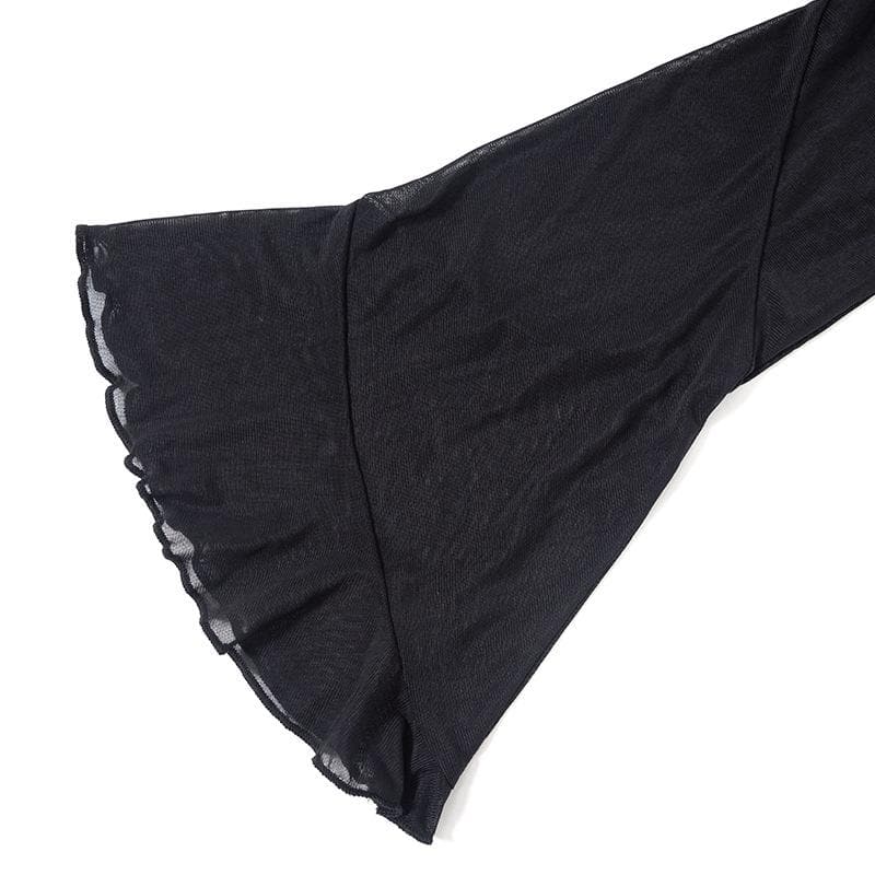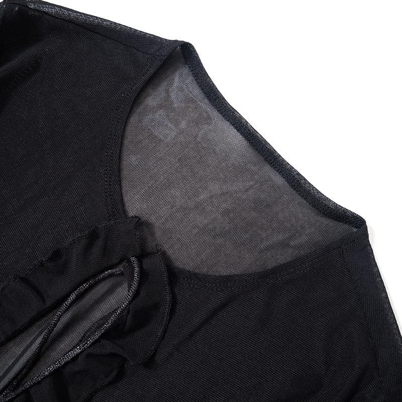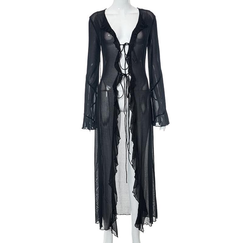 Flared sleeve ruffle sheer mesh see through self tie maxi dress