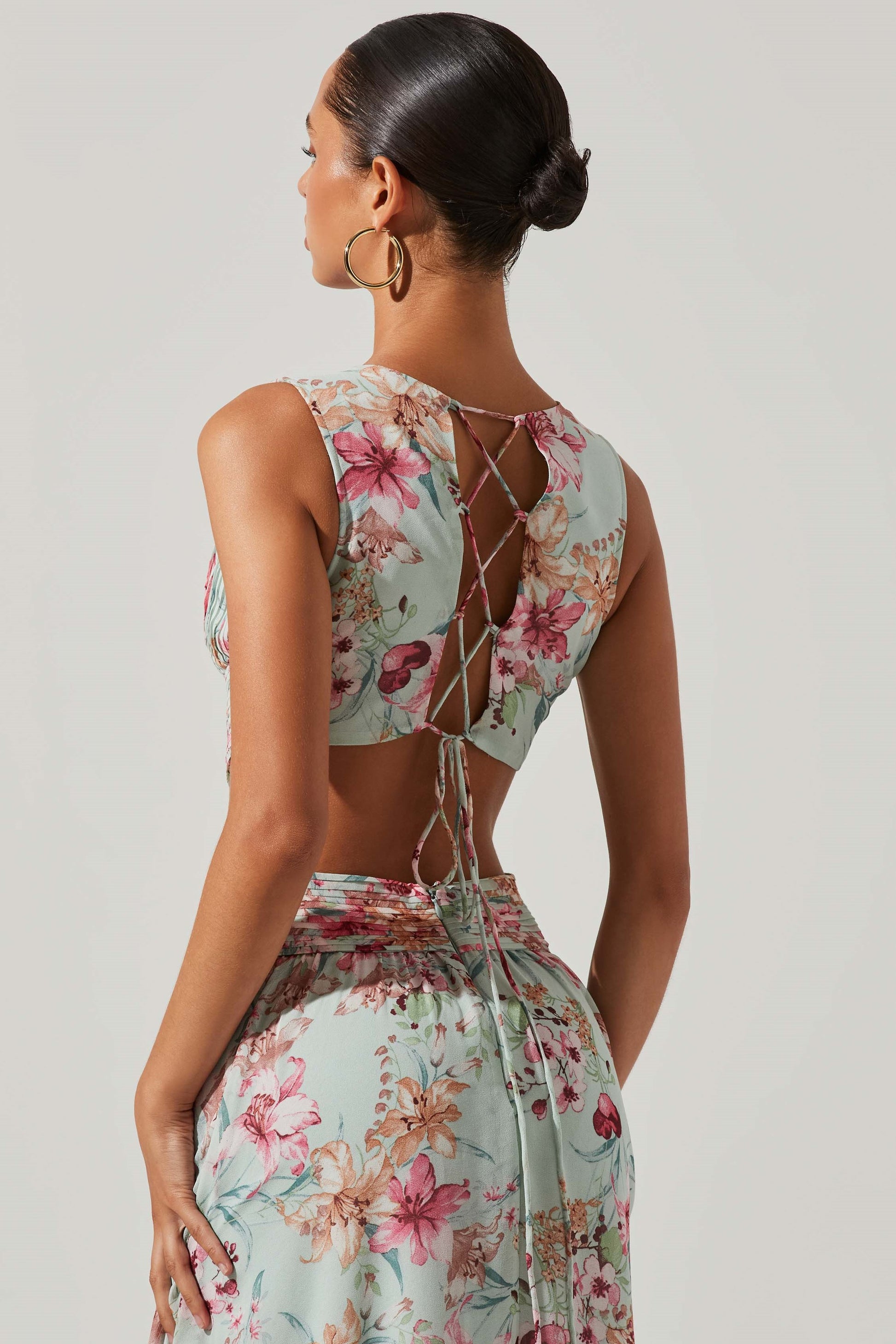 Floral V-Neck Pleated Cut-Out Ruffle Hem Maxi Dress