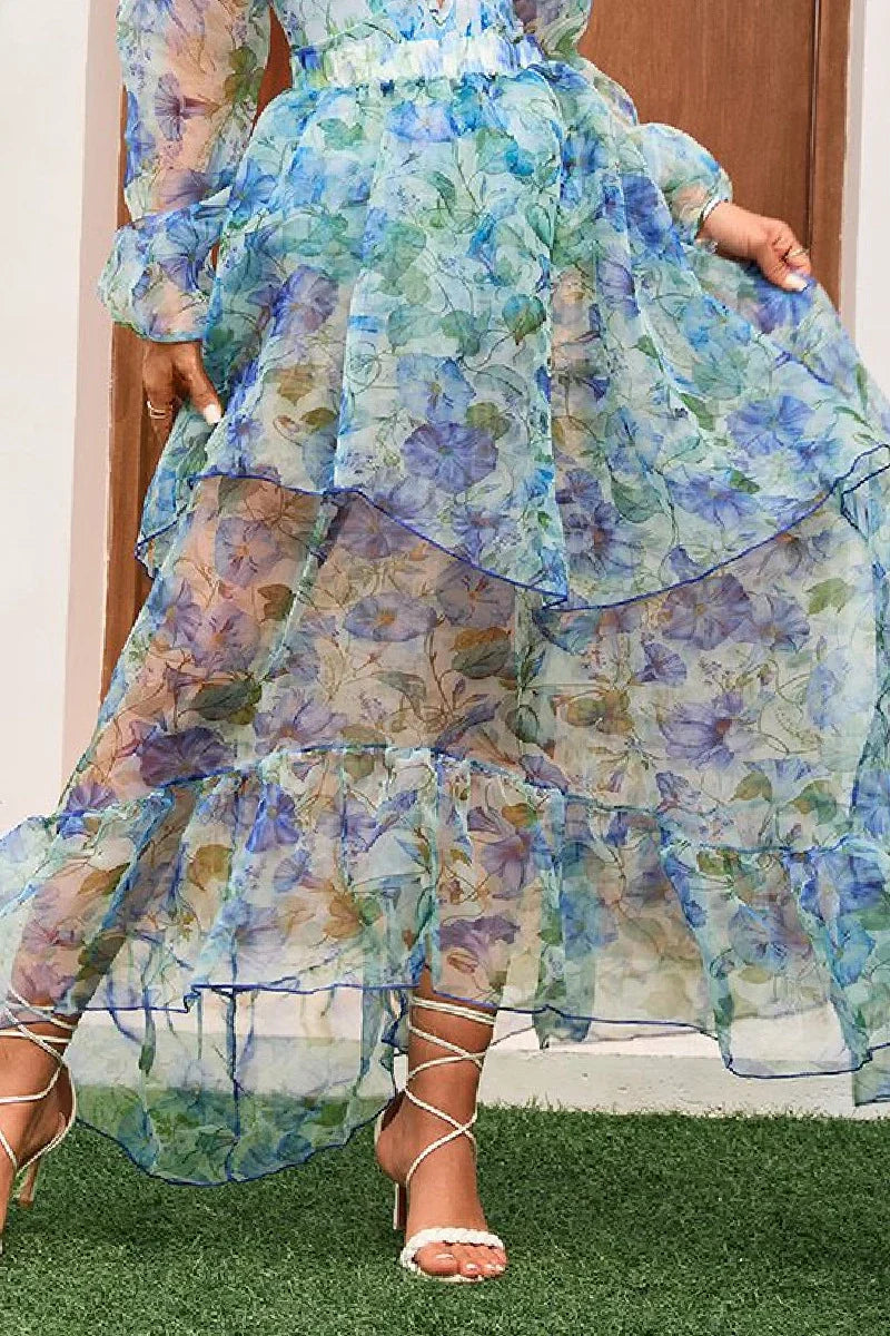 V-neckline with floral appliqués adds romantic detail allover print enhances the vacation aesthetic long sleeves offer light coverage with a chic edge stretch fabric provides a flattering and secure fit.