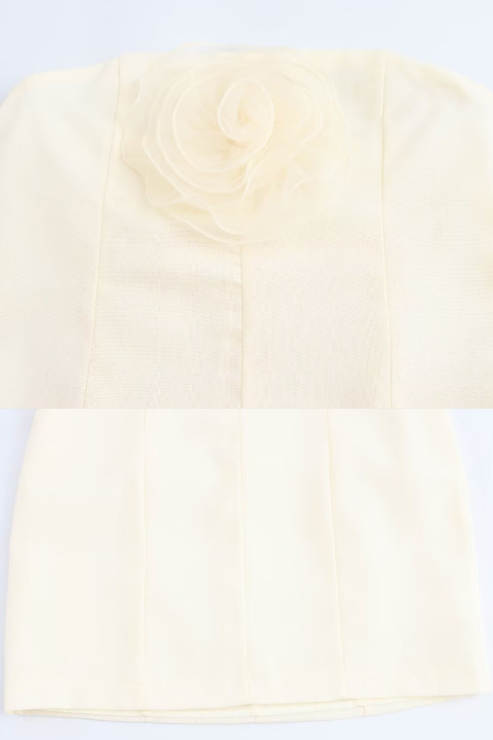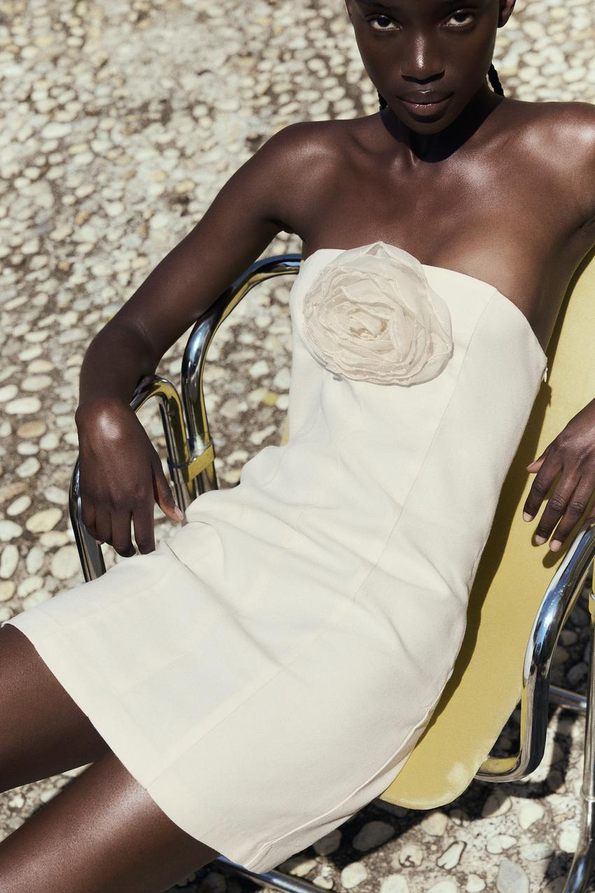 Straight Neckline, Exposed Shoulders, Flower Detail, Mini Length.