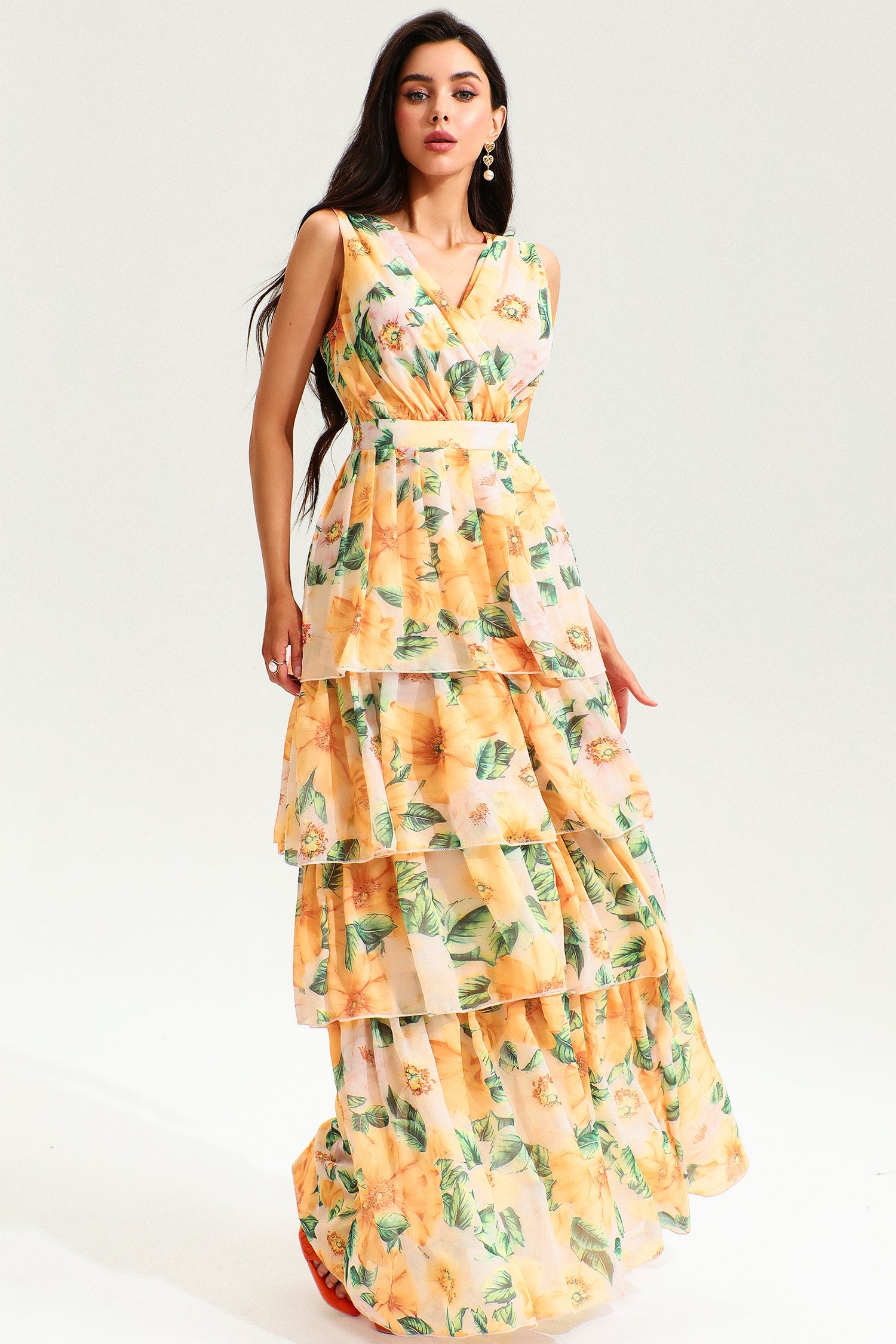 - Backless, sleeveless, tiered hem, V-neck