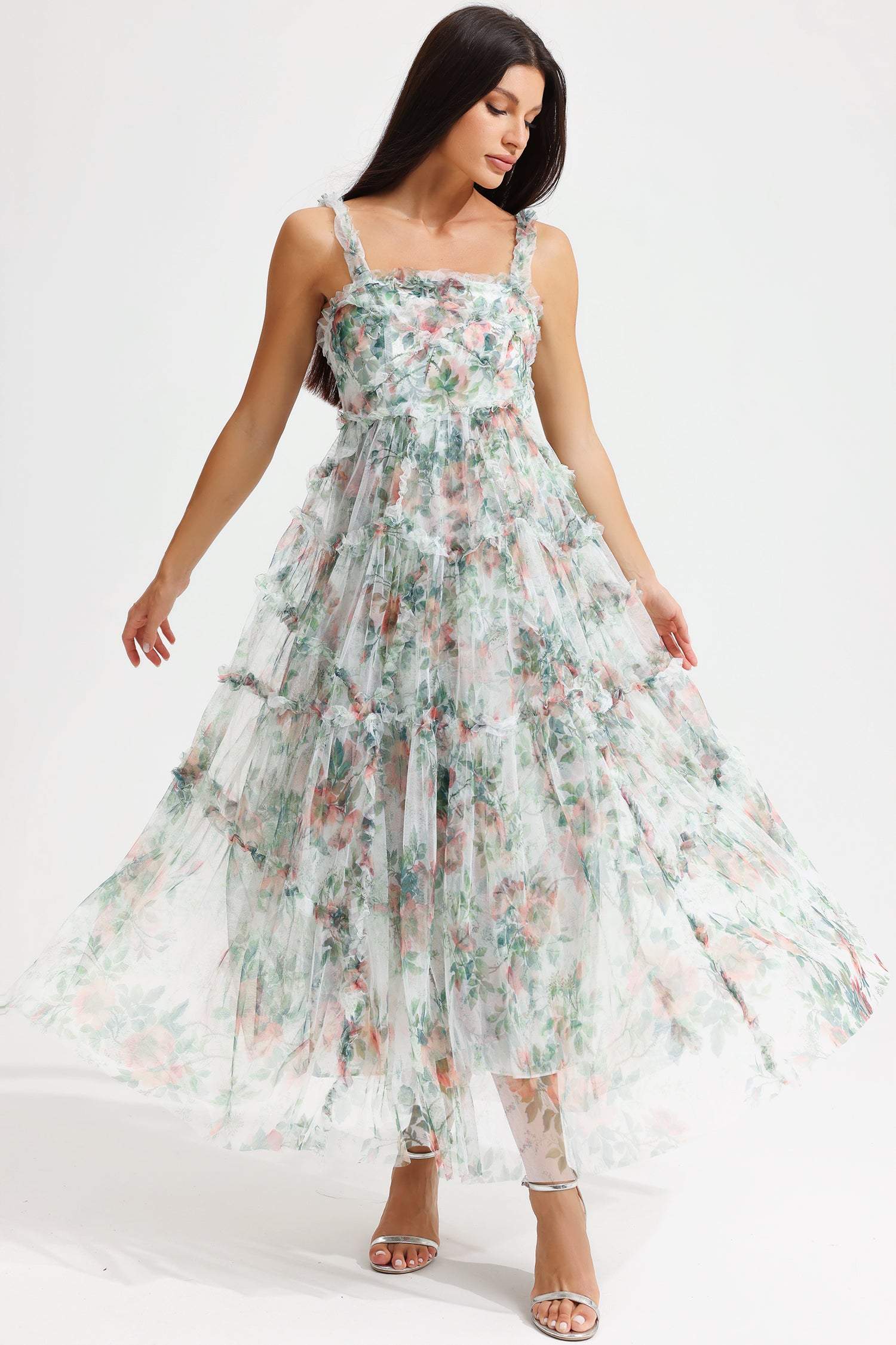 Floral Cami Tapered Waist Frill Hem Midi Dress Green