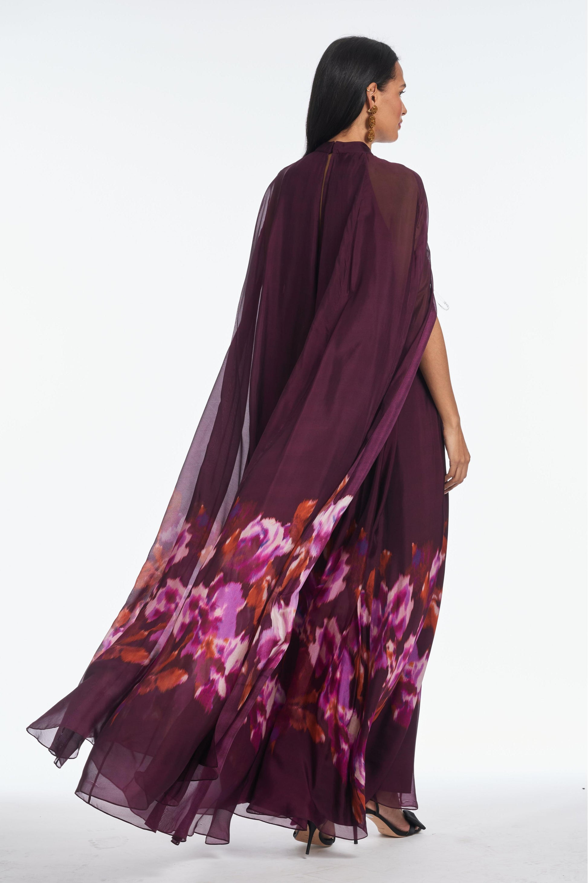 - Cape sleeve, floral print, purple, low neck, maxi dress