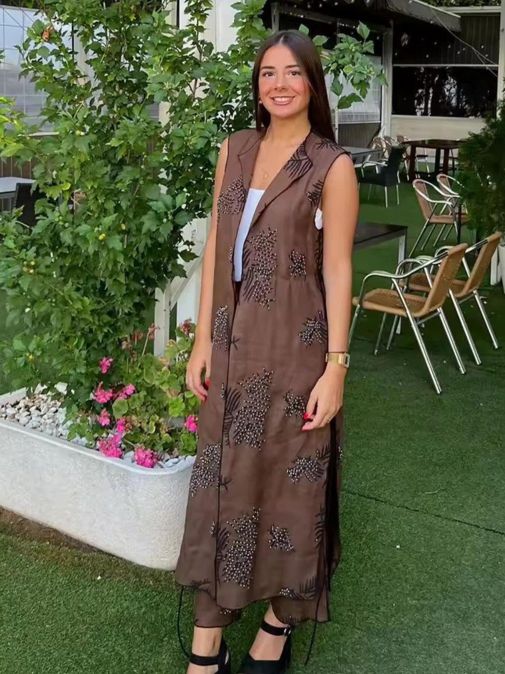 Floral Embroidery Beaded Sleeveless Lapel Long Vest & High Waist Wide Leg Pant Coord Set