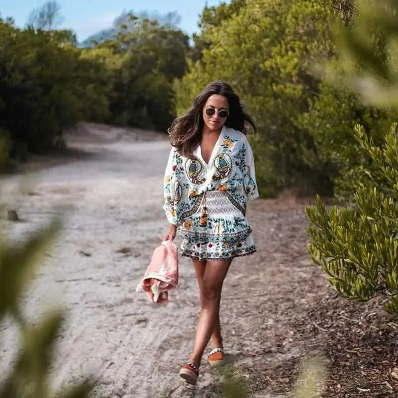 Floral Embroidery Boho Batwing Sleeve Dress
