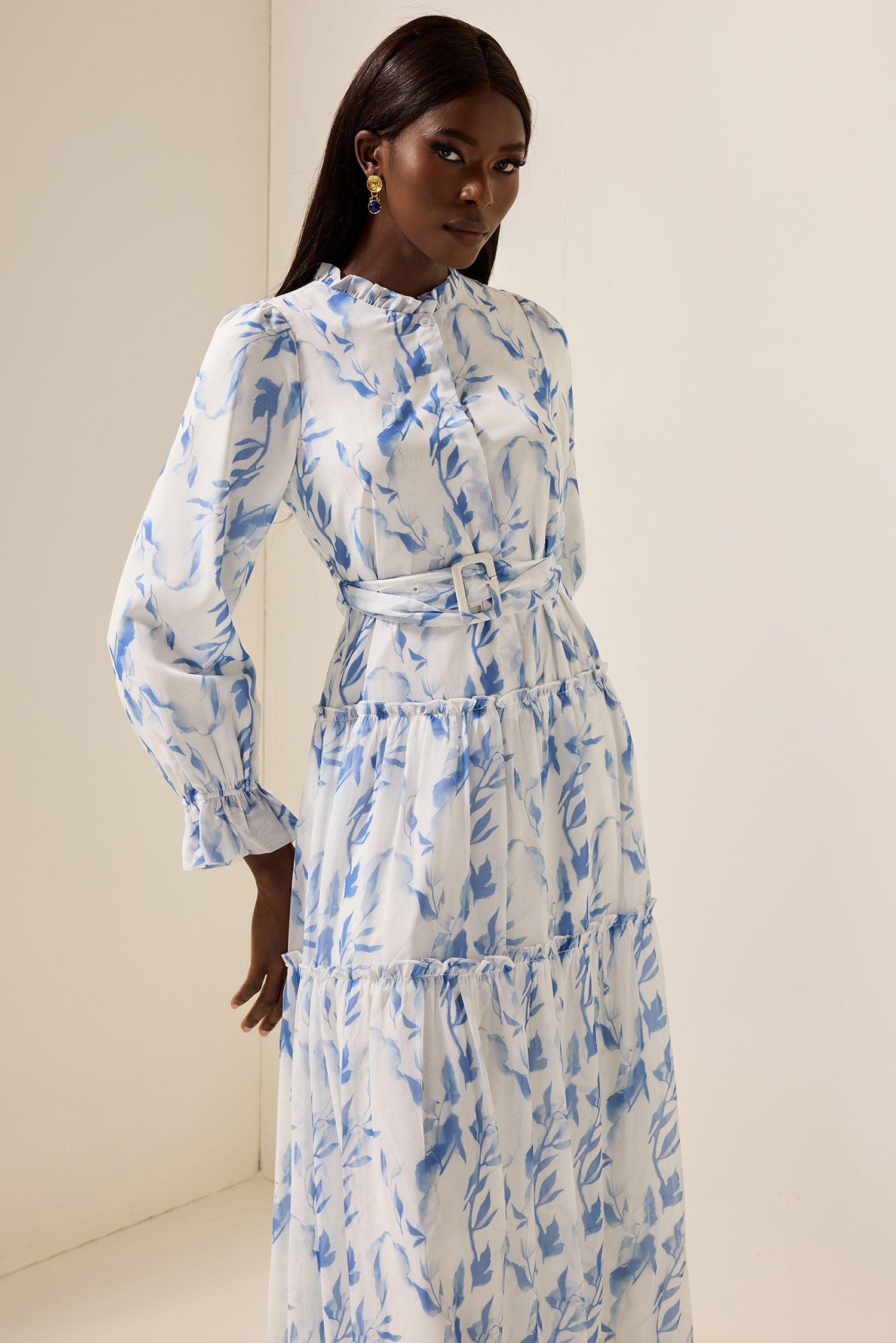 Floral Frill Lantern Sleeve Maxi Dress With Belt
