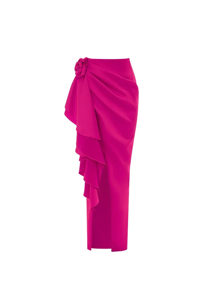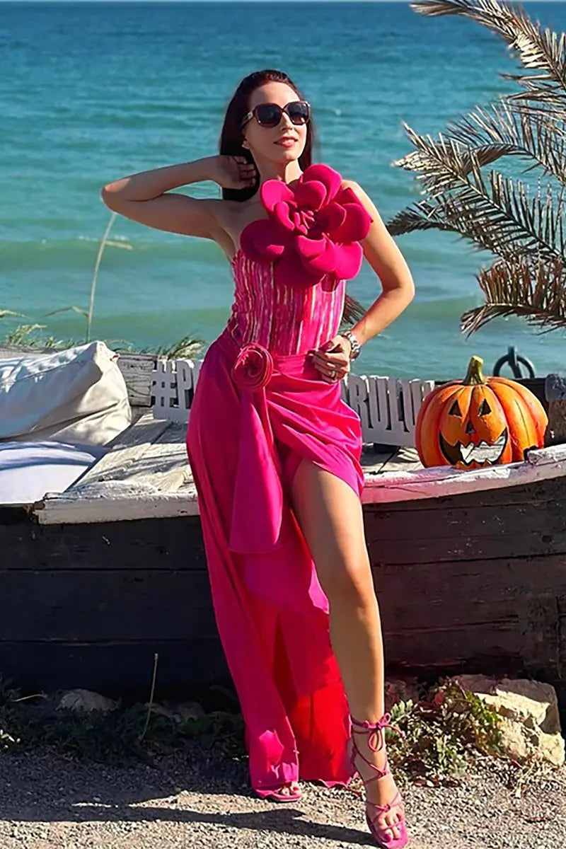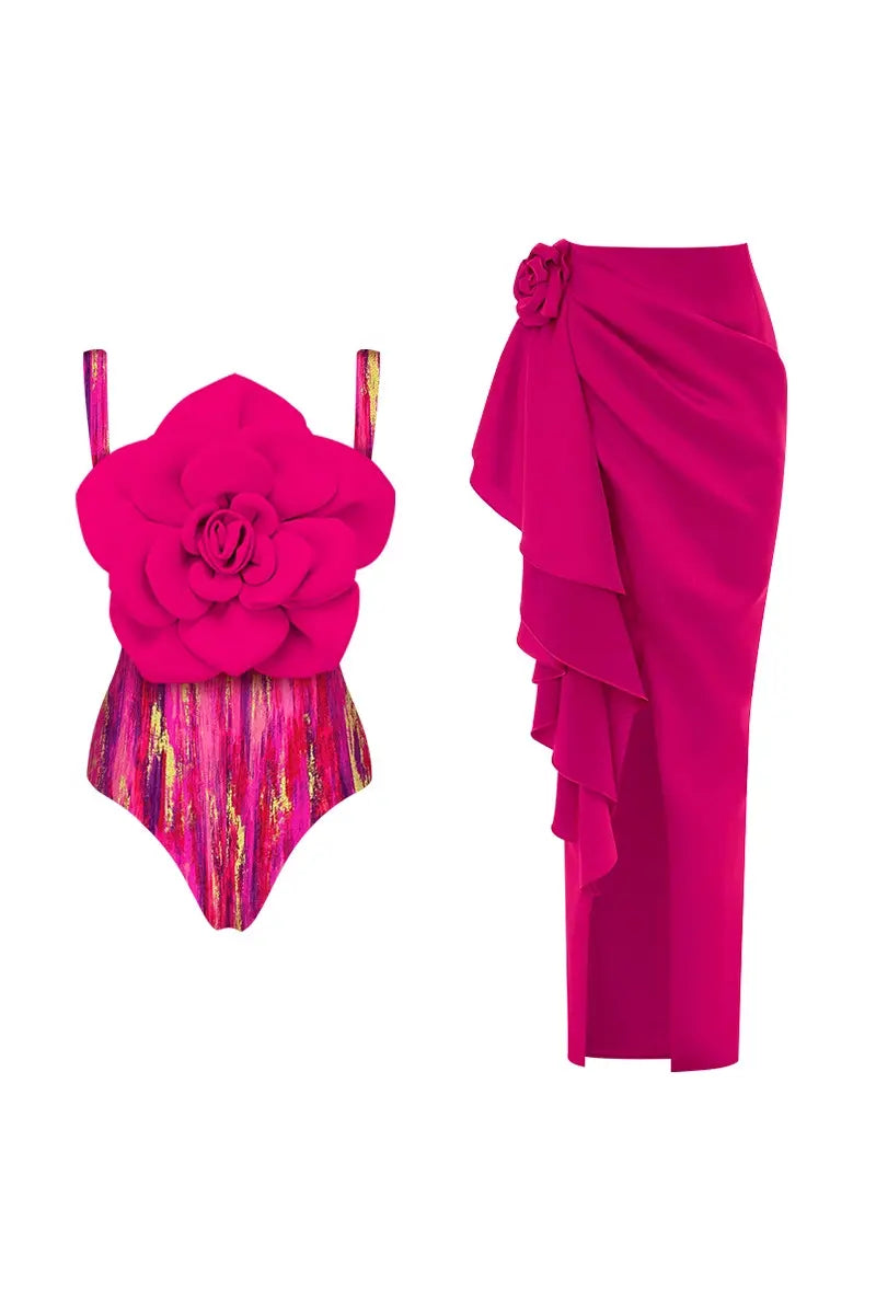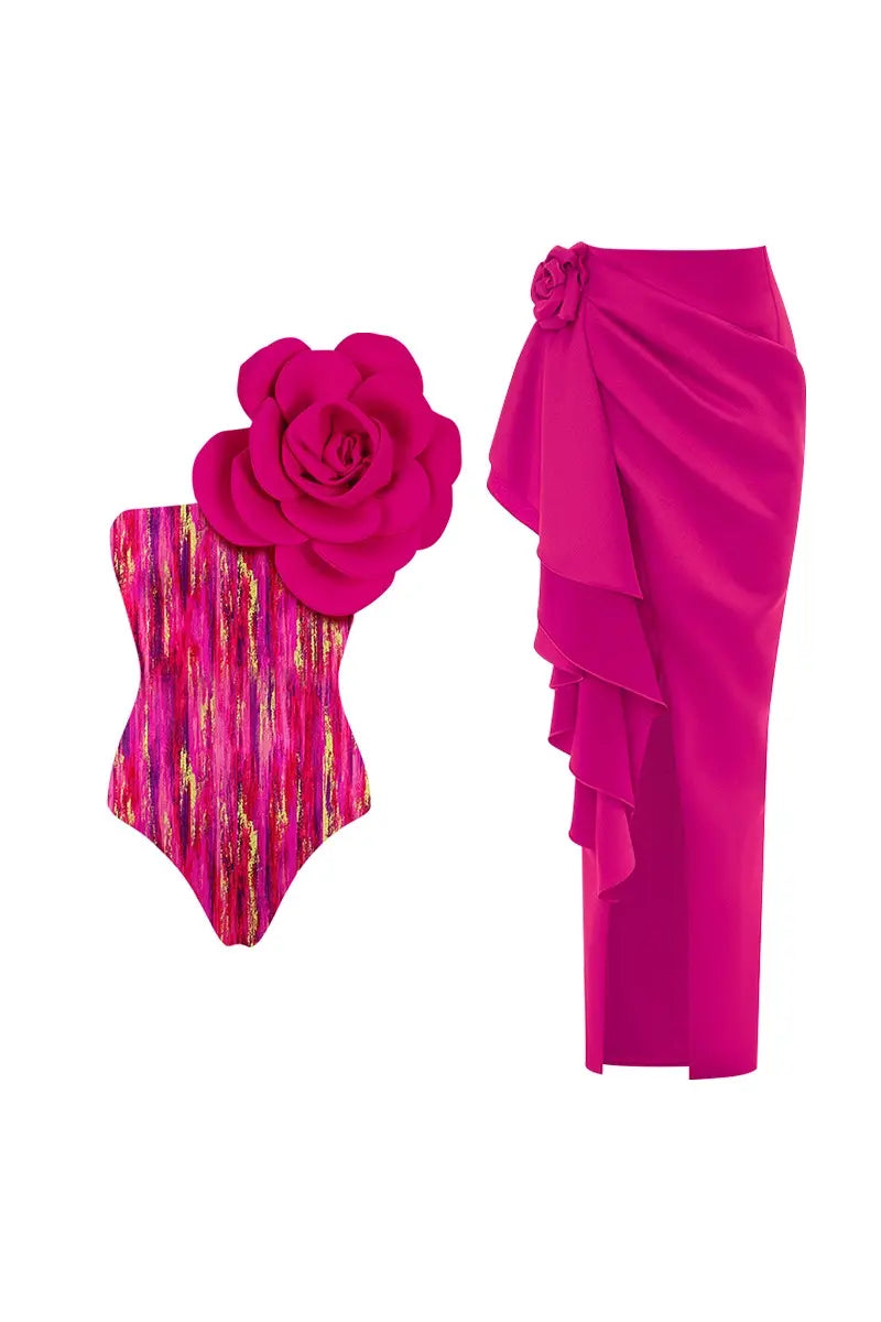 This statement-making one-piece swimsuit features a bold 3D floral embellishment at the chest, adding dramatic flair to its vibrant printed design. The structured silhouette flatters the figure while offering both style and support, crafted from high-stretch, quick-dry fabric for maximum comfort. The set includes a coordinating piece, such as a wrap skirt or cover-up, to elevate the look and make it perfect for stylish beach days or tropical vacations.