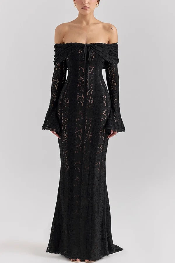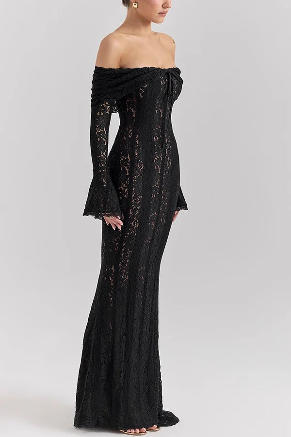 Floral Lace Off Shoulder Flare Sleeve Fishtail Maxi Dresses-White