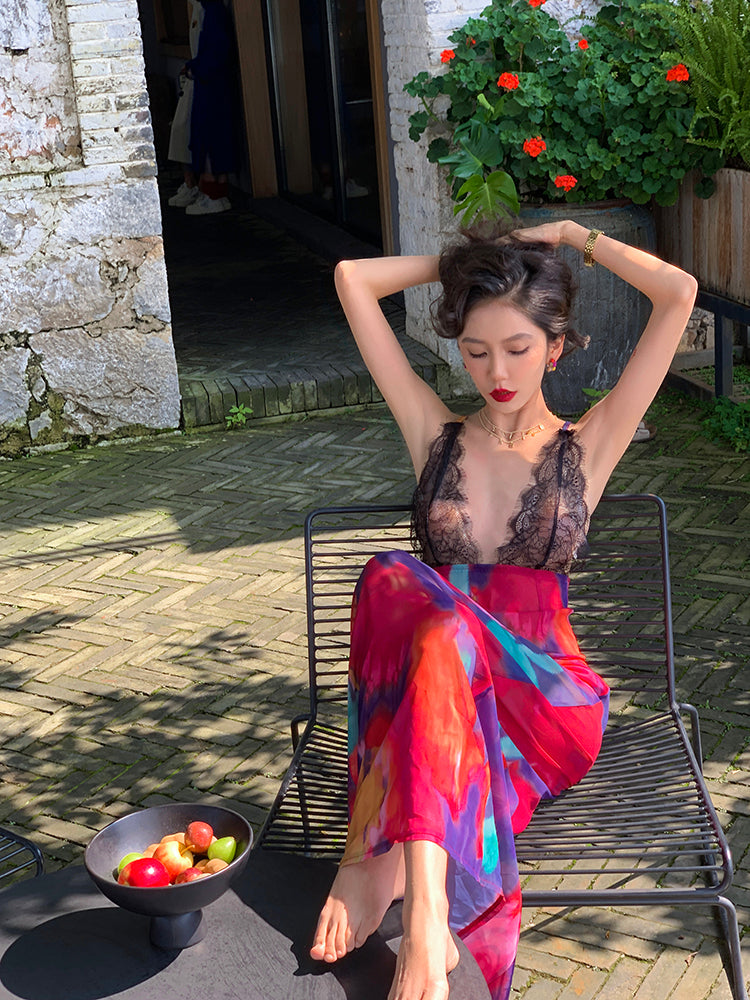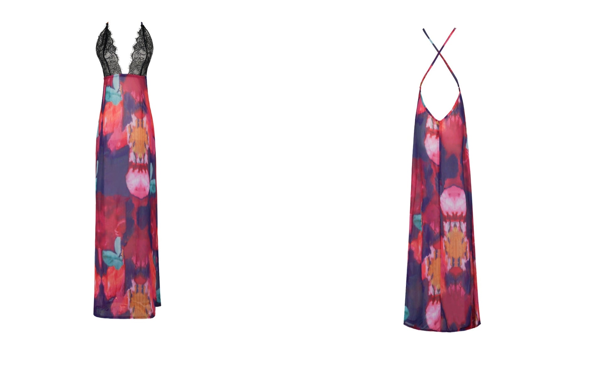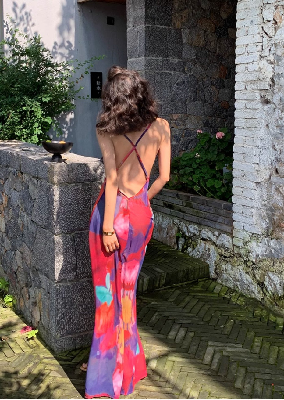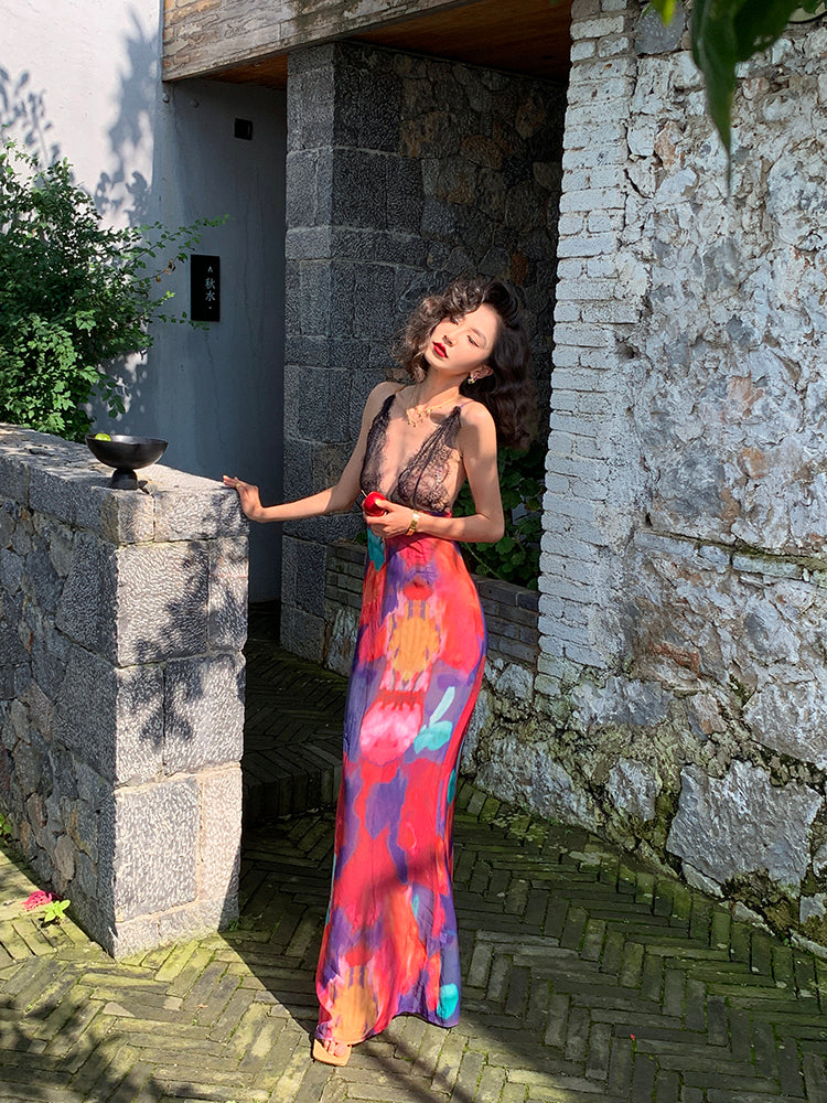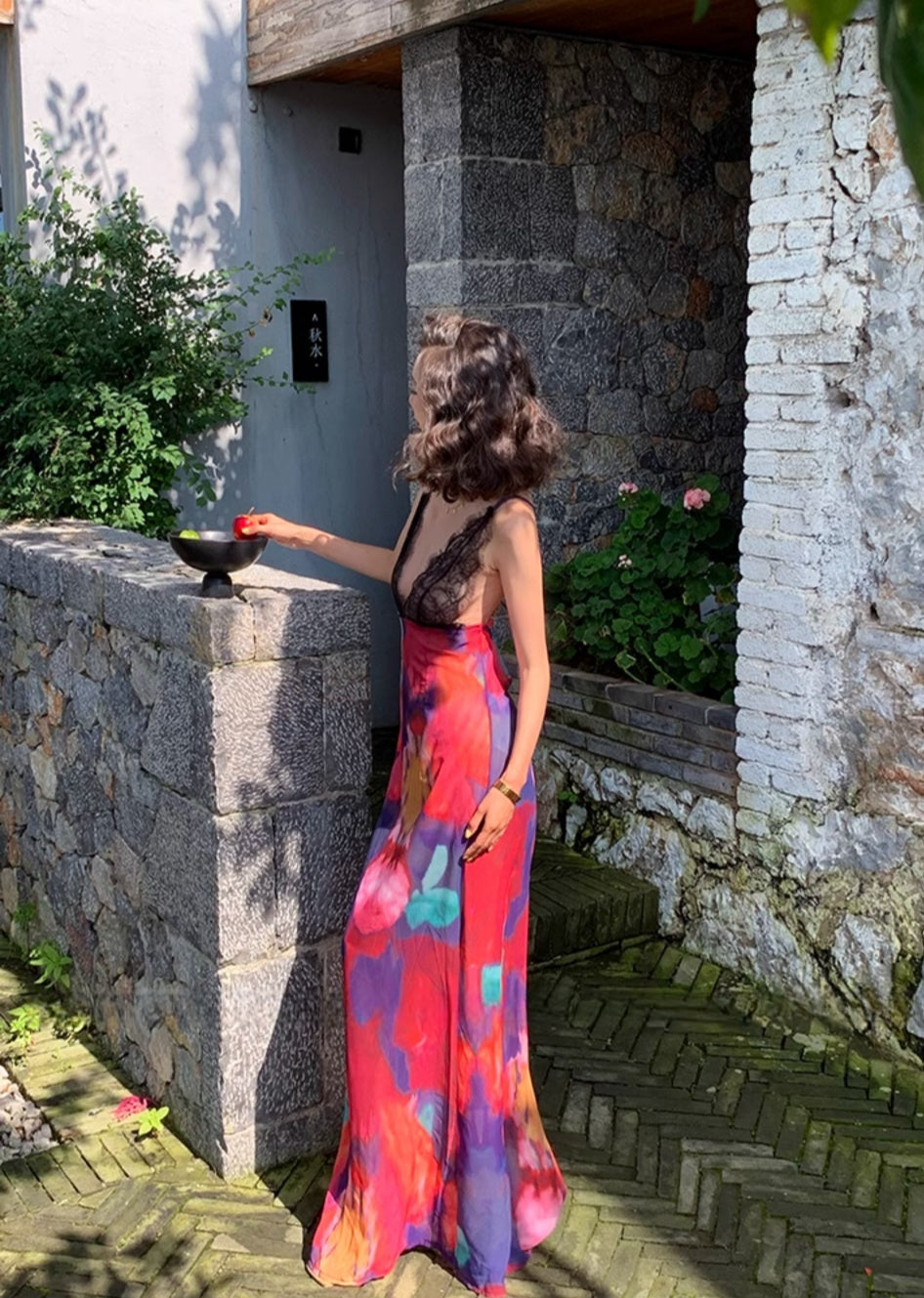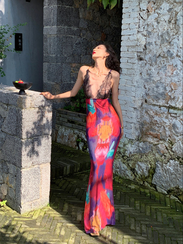 - Floral Lace Sheer V-Neck Dress - Sexy High-Waist Backless Vacation Maxi Gown