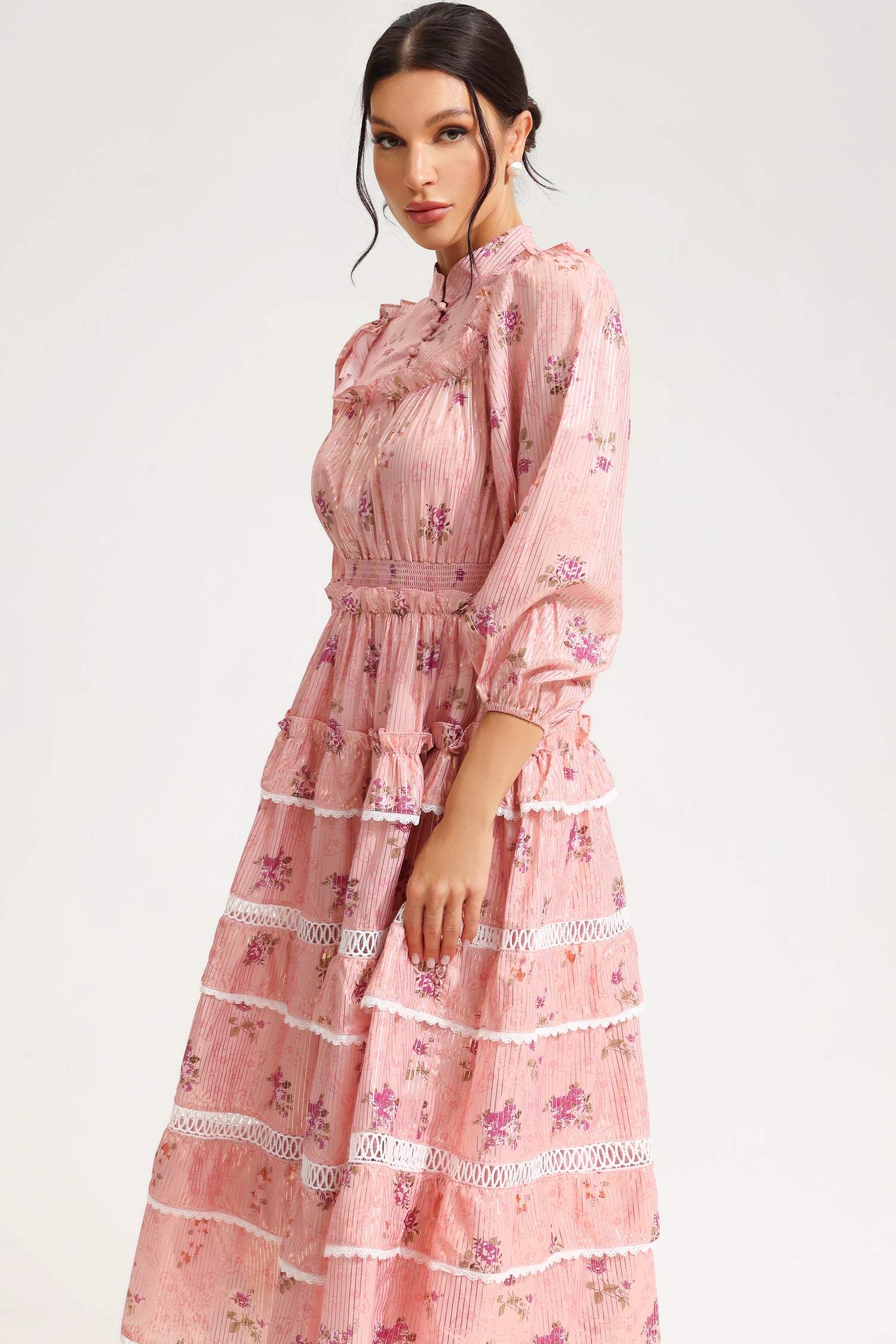 Floral Lantern Sleeve Buckle Midi Dress Pink
