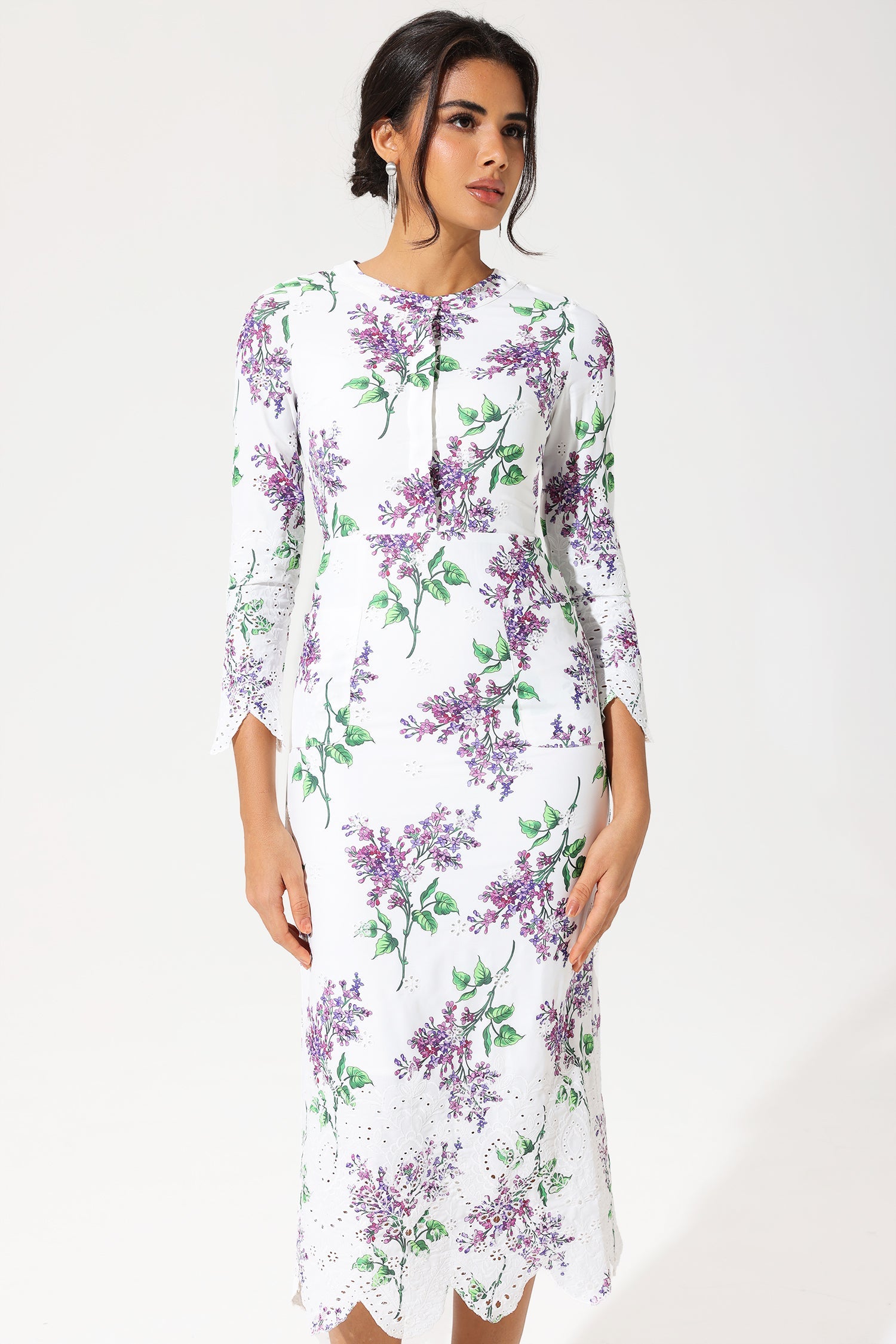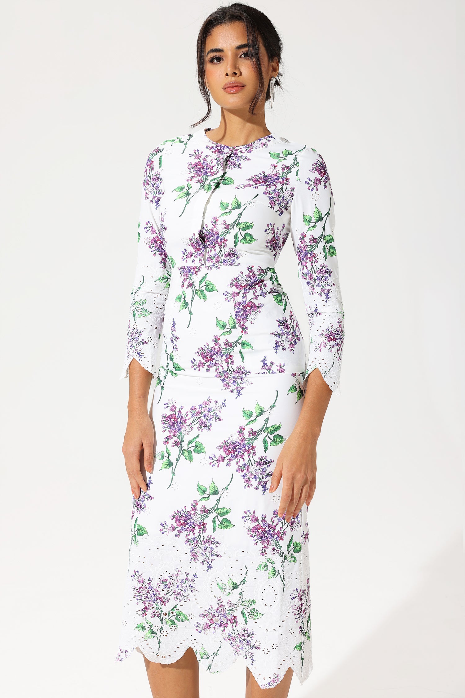 Floral Long Sleeve Crew Collar Broderie Anglaise Maxi Dress
