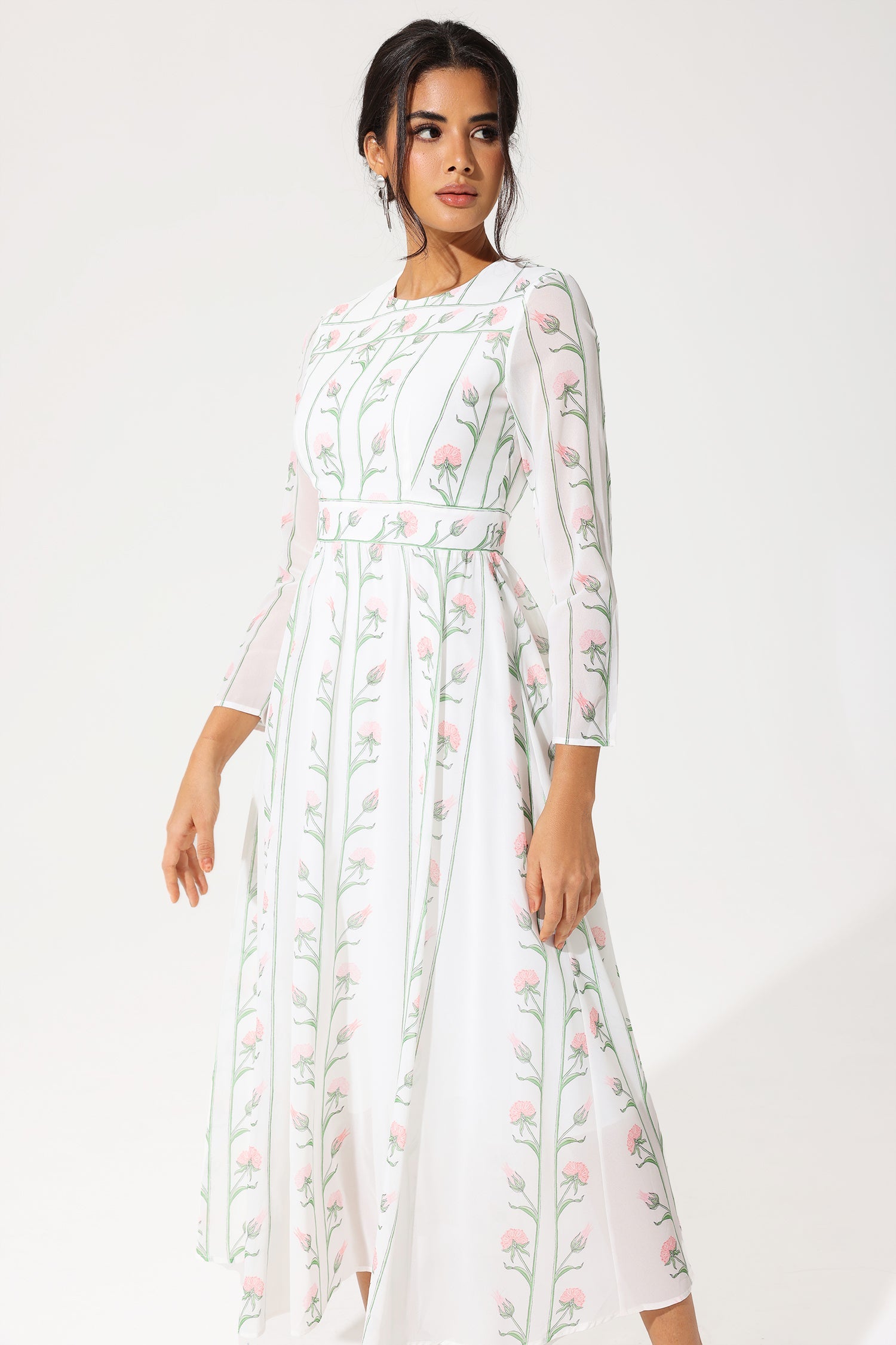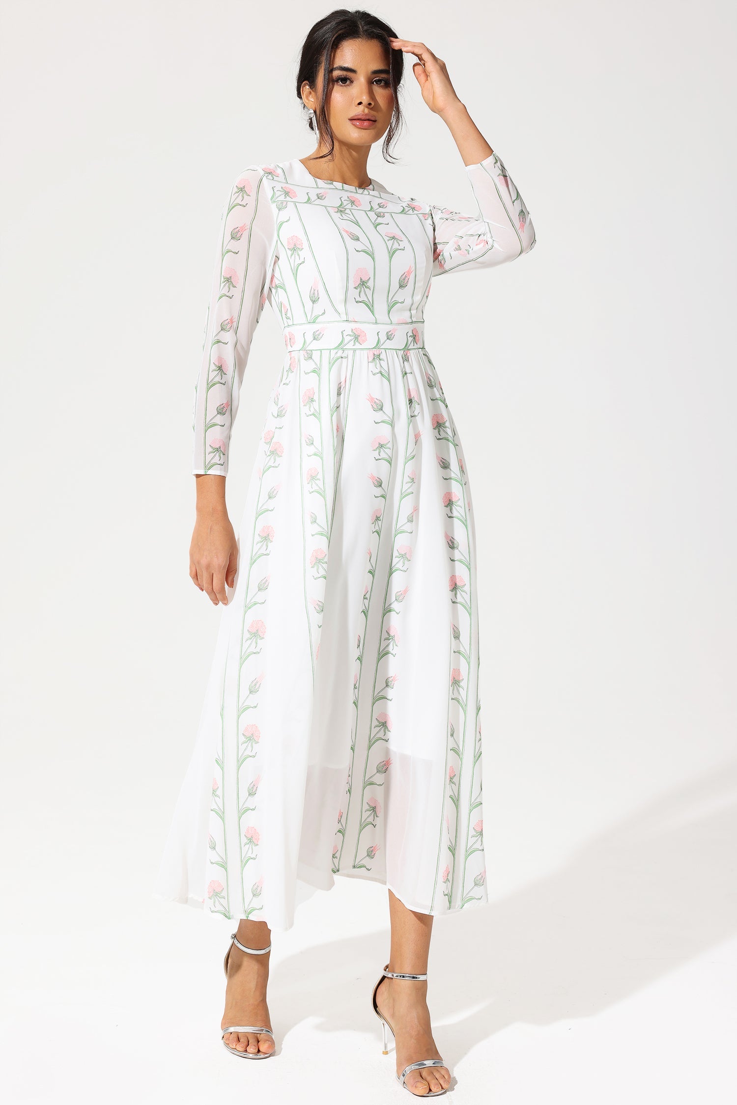 Floral Long Sleeve Crew Collar Georgette Midi Dress