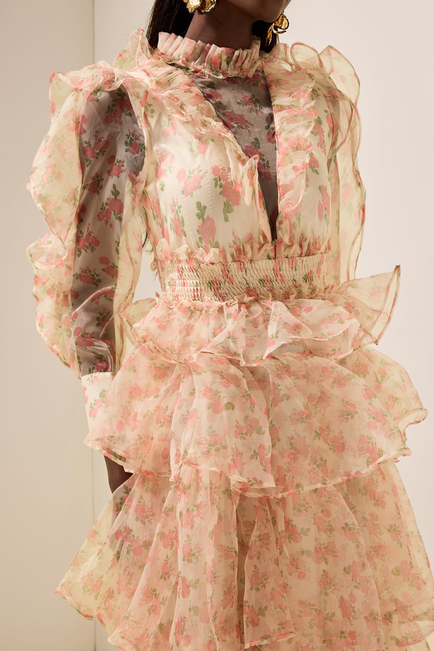 - Long sleeve, floral print, apricot, smocking tiered, midi dress