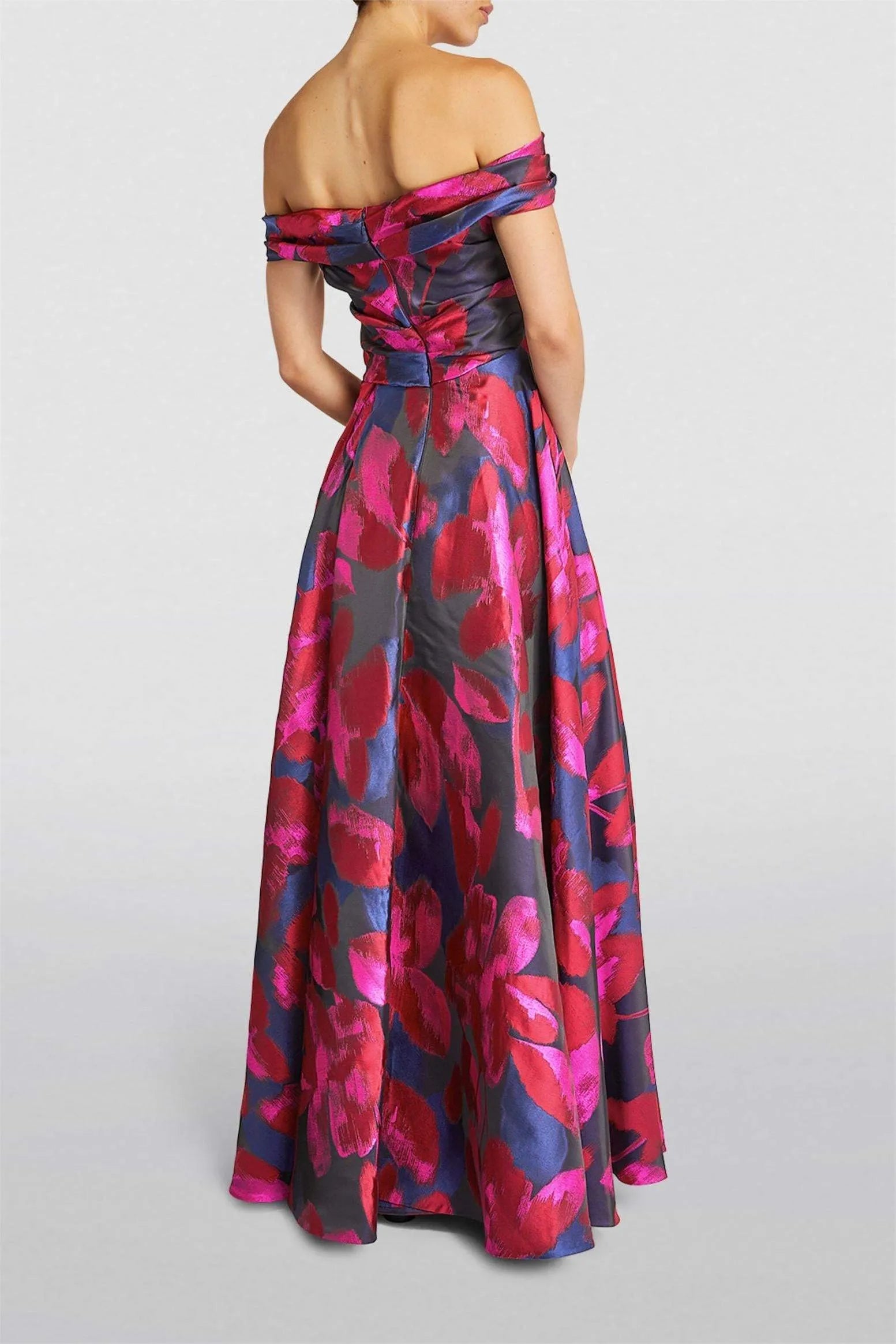 Floral Off-Shoulder Pleated Tapered Waist Gown