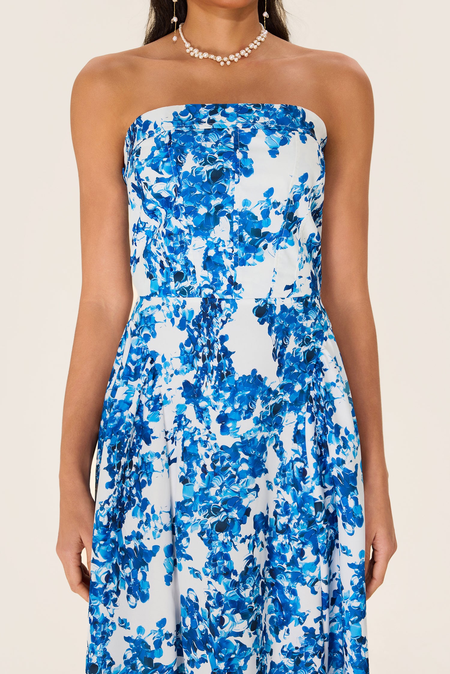 - Sleeveless, blue, floral printed, strapless, midi dress