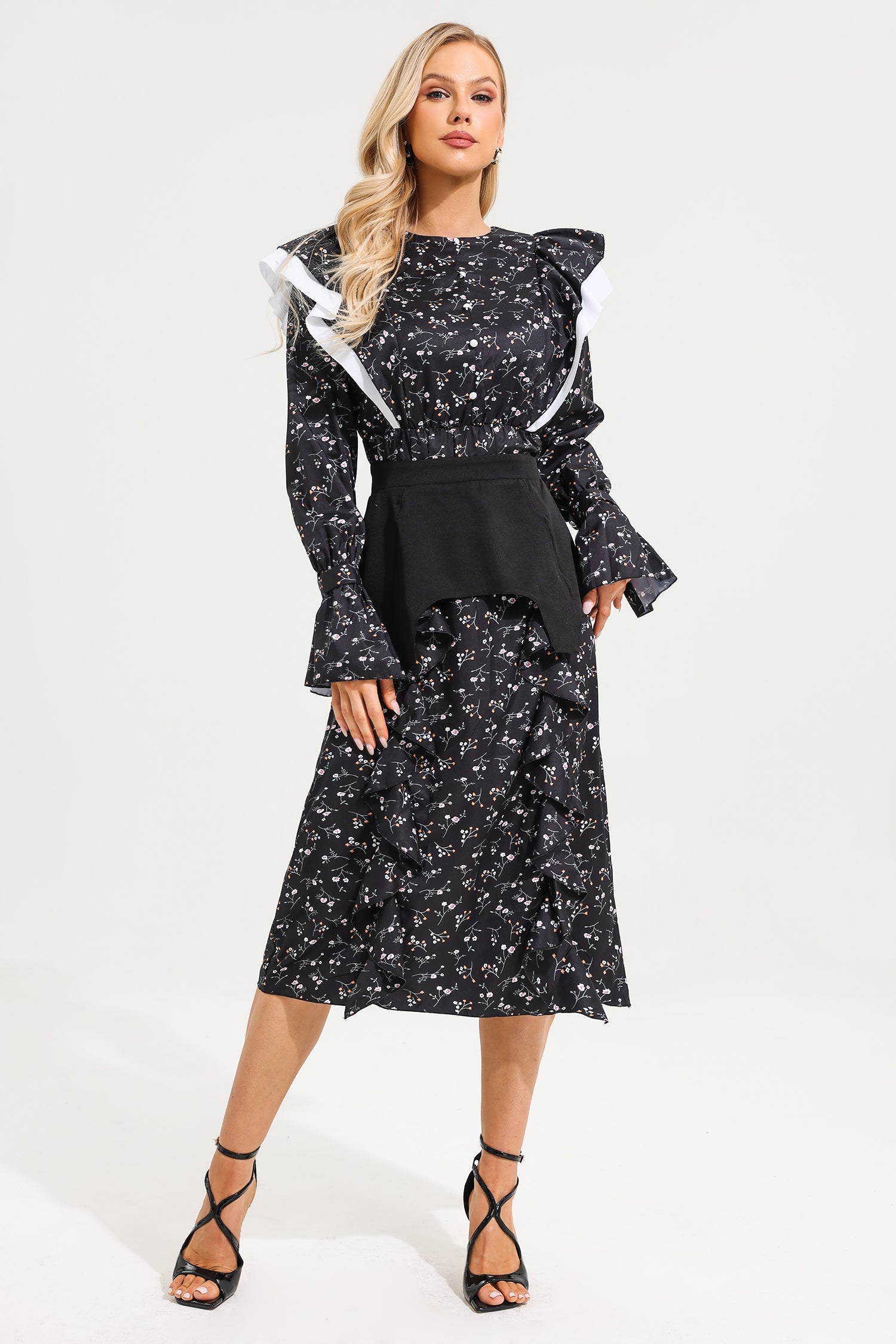 Floral Ruffle Ball Sleeve Midi Dress With Belt