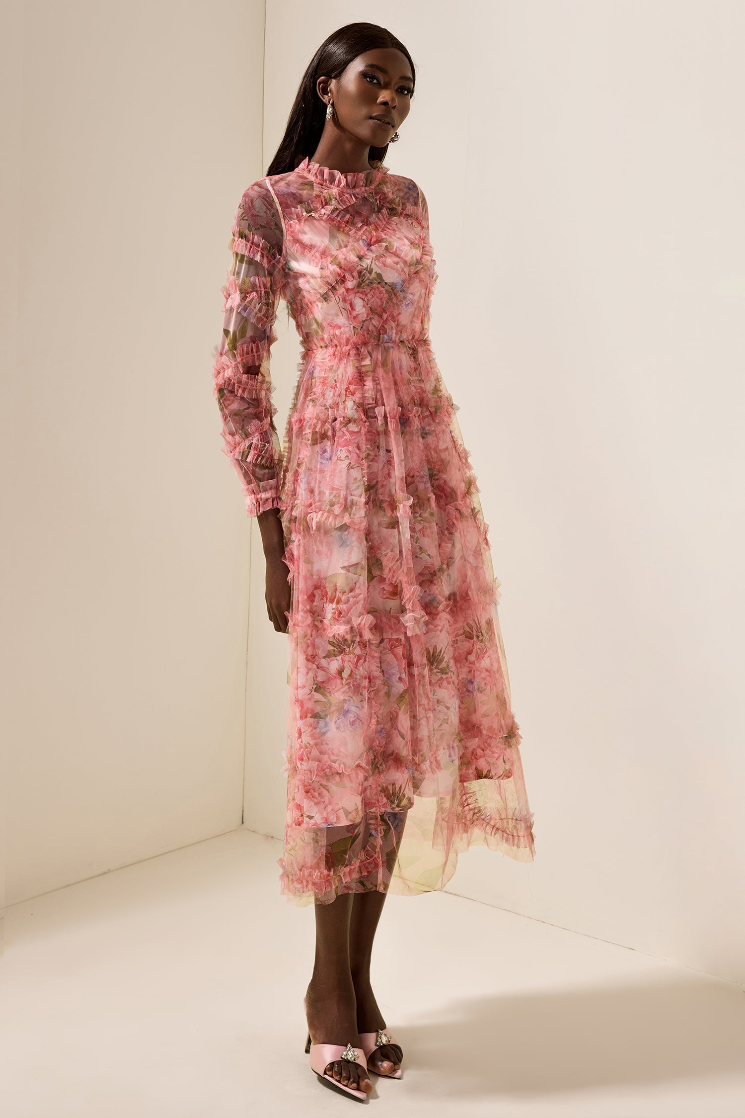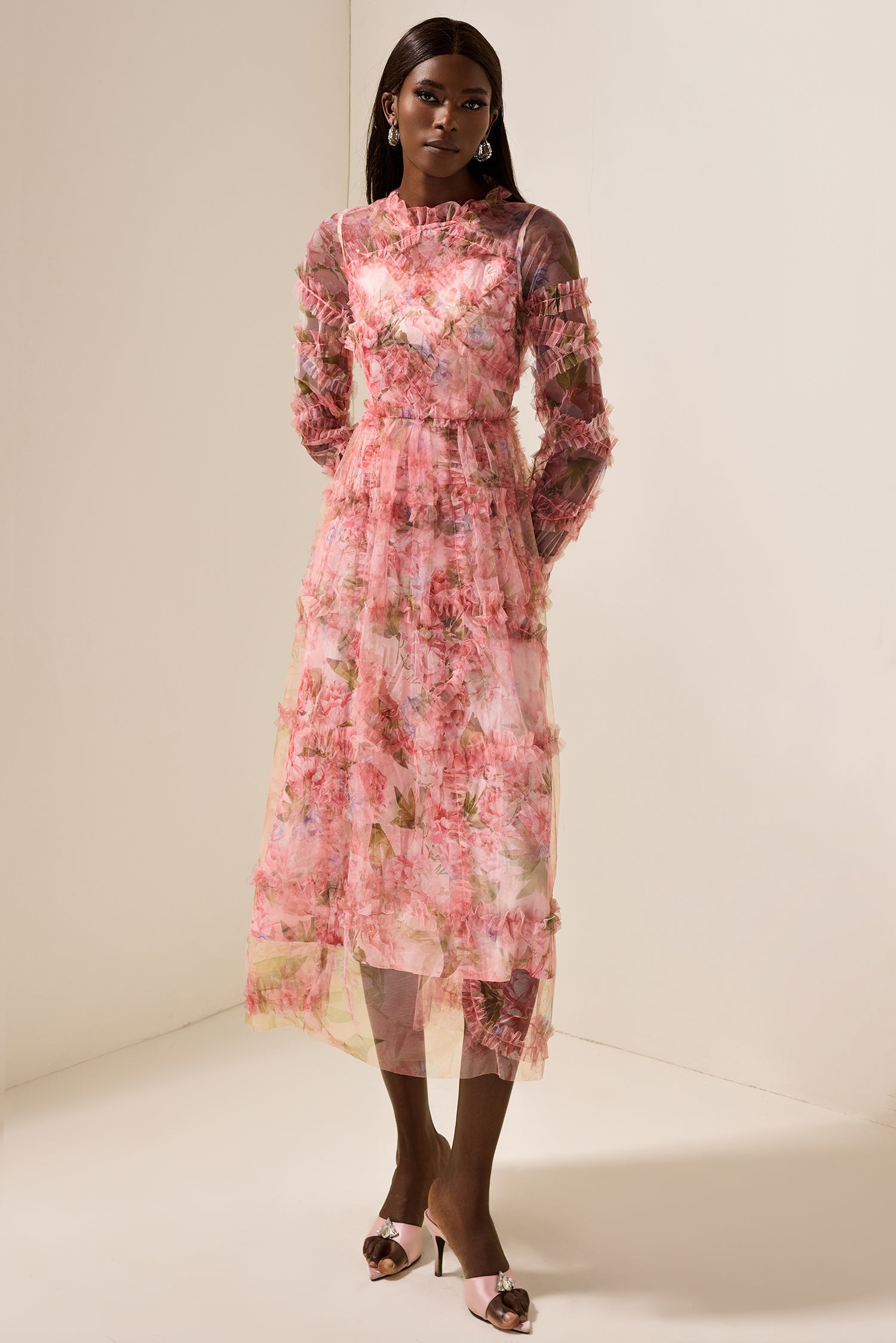 - Long sleeve, floral print, pink, ruffle, tiered, midi dress